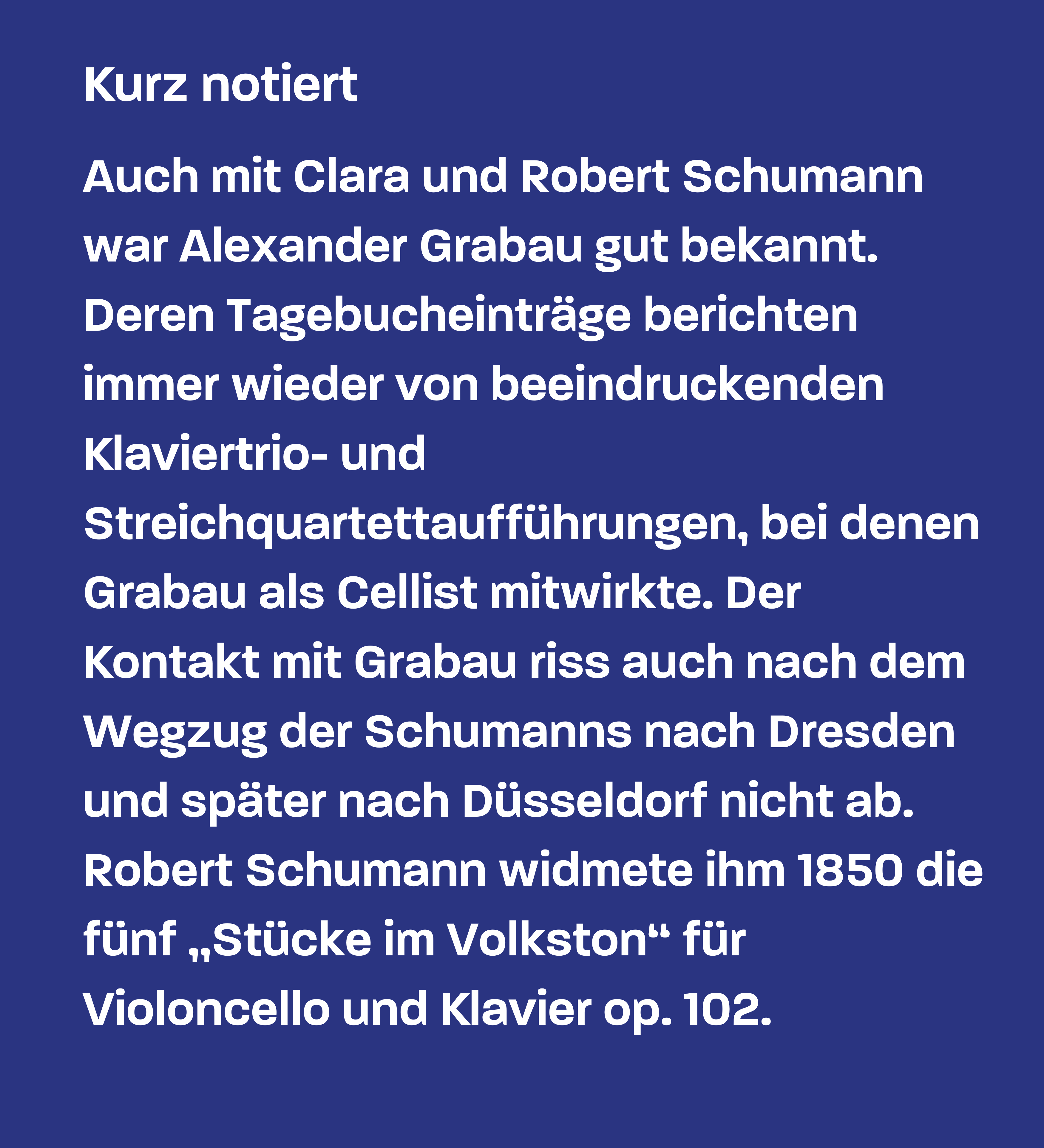 Paul Mendelssohn Bartholdy (1812-1874) war der Cellist innerhalb der musikalischen Familie Mendelssohn. Trotz seiner Karriere als Banker – nach Lehrjahren in London und Paris trat er 1833 in das familieneigene Unternehmen ein und wurde 1838 Teilhaber des Bankhauses Mendelssohn & Co. – brachte er es auf diesem Instrument zu beachtlichem Können. So kam er auch für seinen drei Jahre älteren Bruder Felix als Musikpartner in Frage, als dieser bereits berühmt und anspruchsvoll war. Die 1829 vollendeten Variationen concertantes D-Dur op. 17 hatte Felix für seinen Bruder komponiert, aber auch die große, dreisätzige Sonate B-Dur op. 45, die 1838 entstand. (Für deren virtuosen Klavierpart hatte Felix sicherlich auch seine Schwester Fanny in Berlin im Auge, denn die Eisenbahnverbindung von Berlin nach Leipzig über Köthen wurde erst 1841 in Betrieb genommen ...) Allerdings war Paul nicht der einzige Adressat dieses Werkes – es ist überliefert, dass Felix als Gewandhauskapellmeister die Sonate auch in Leipzig mehrmals, am Klavier sitzend, zur Aufführung brachte. Sein Duopartner war dann Alexander Grabau (1808-1884), der seit 1828 bis zu seinem Tod im Gewandhausorchester als Cellist mitwirkte.