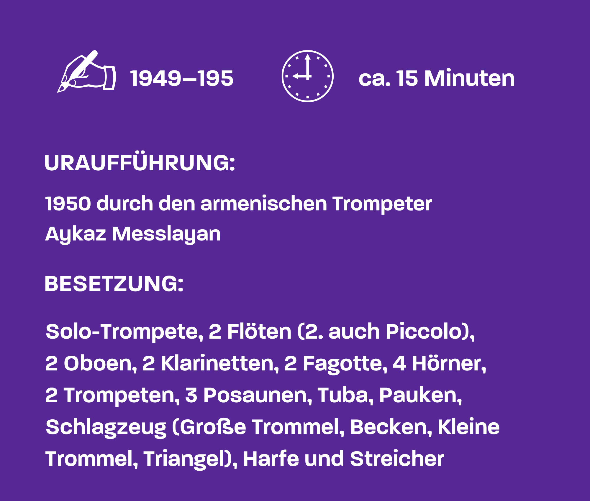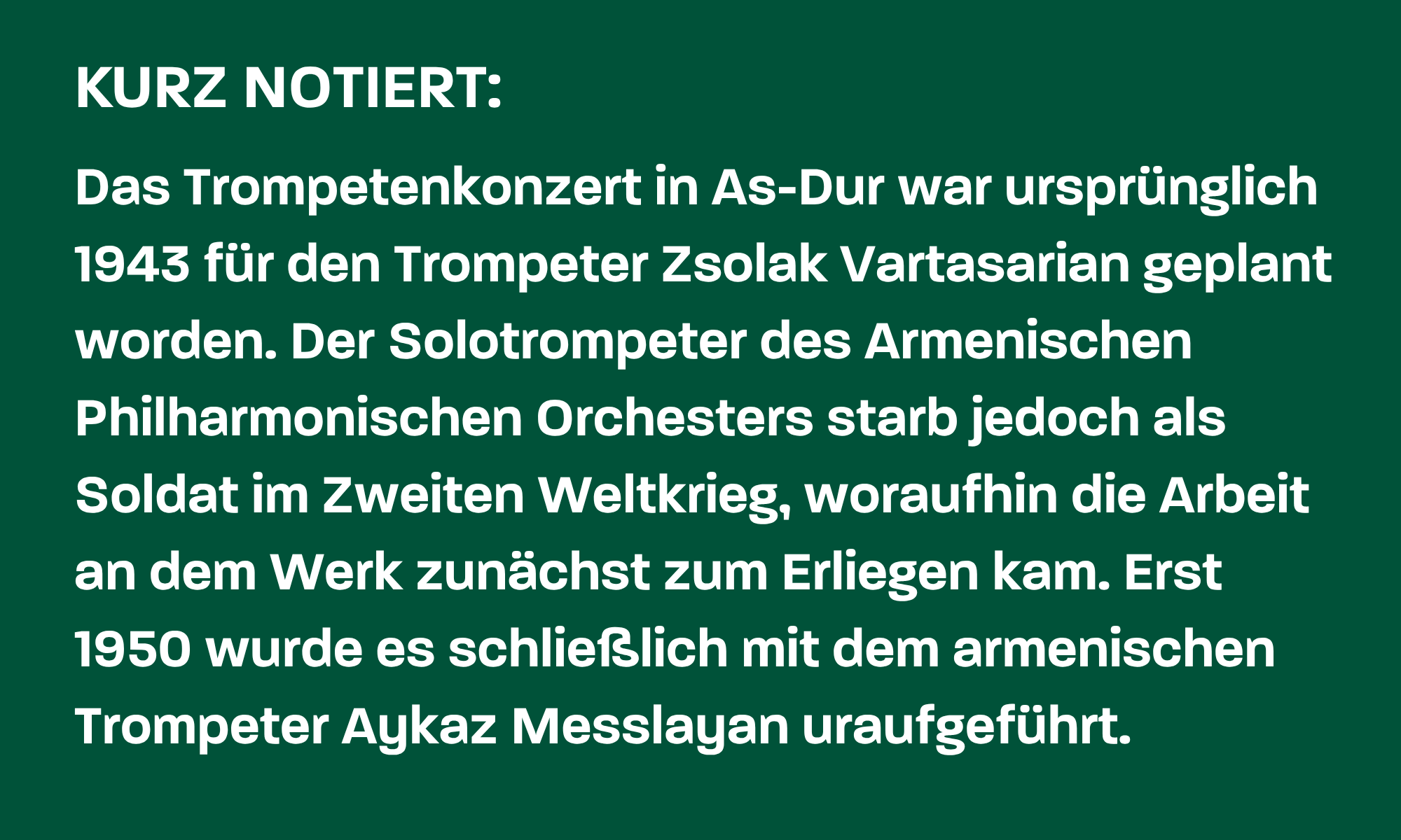 „Ich finde, dass Arutjunjans Musik sehr ehrlich und echt ist, irgendwie auch sehr menschlich. Sie fühlt sich an, als hätte er sie wirklich ernst gemeint“, sagt die norwegische Trompeterin Tine Thing Helseth in einem Interview. Nicht umsonst ist das Trompetenkonzert von Alexander Arutjunjan ein beliebtes Wettbewerbsstück: Den Solist*innen bietet es ein breites Spektrum an technischen und gestalterischen Herausforderungen: Virtuose Passagen wechseln sich ab mit ausdrucksstarken, lyrischen Melodien.