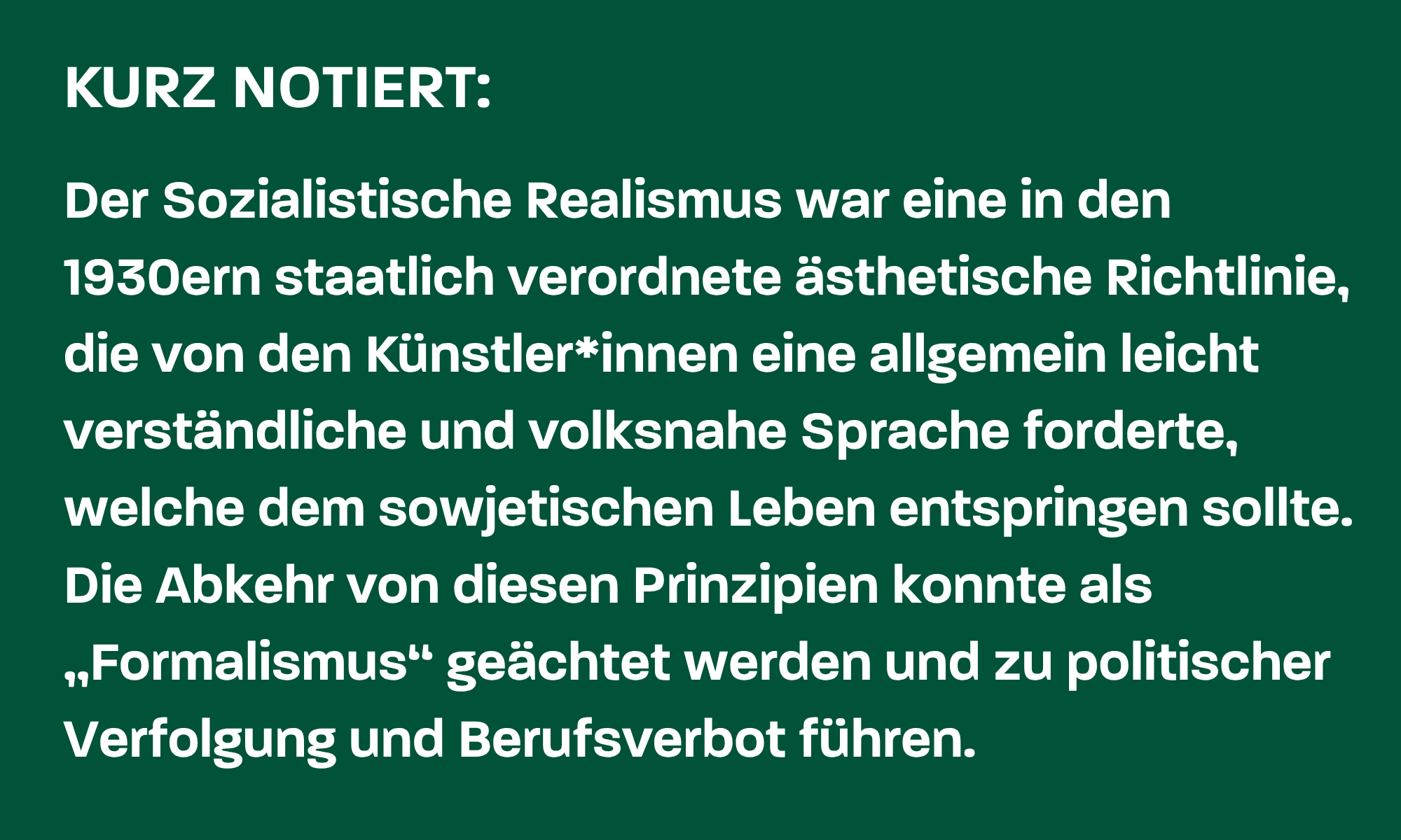 Unter diesem massiven politischen Druck war der Komponist gezwungen, sein künstlerisches Schaffen den Dogmen des „Sozialistischen Realismus“ anzupassen. Schostakowitsch zog die Partitur seiner 1936 komponierten avantgardistischen Sinfonie Nr. 4 noch während der Probenphase zurück, da er befürchtete, das Werk könnte seine Lage weiter verschlimmern.