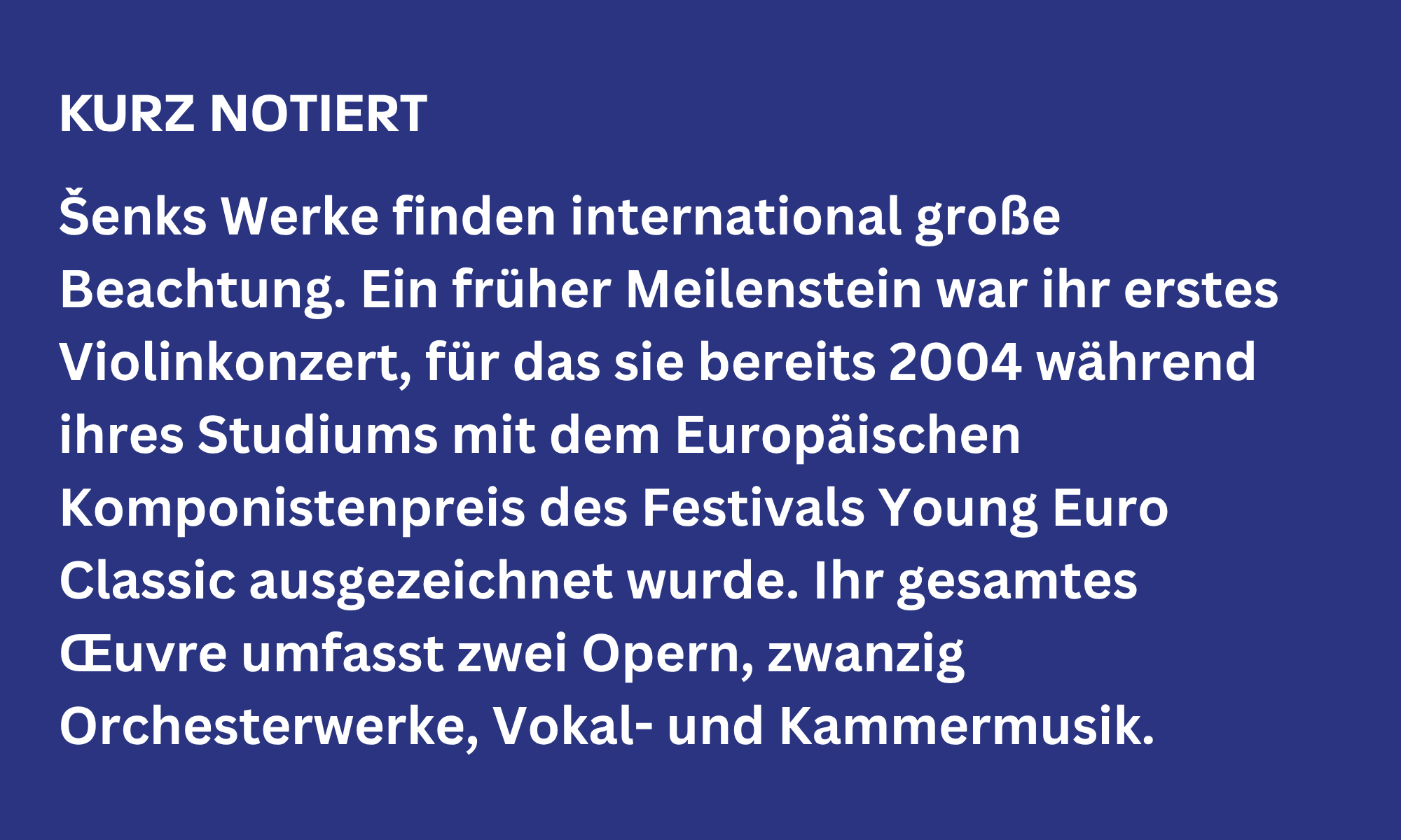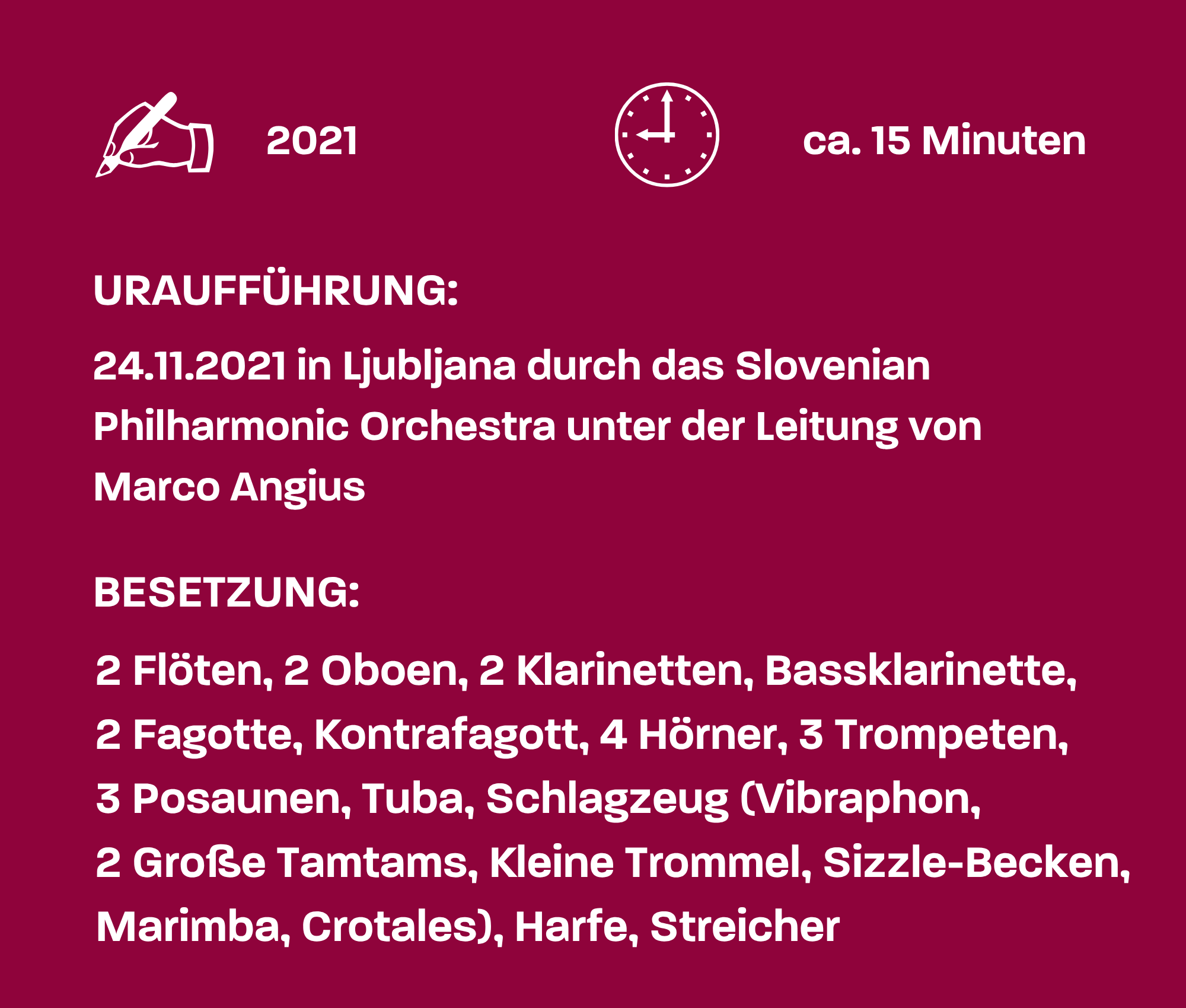 Alles beginnt mit einem „wabernden“ Ton im Horn: Mit im Wechsel geöffnetem und geschlossenem Dämpfer oszilliert das Horn um das „Fis“. Der Anfang von „Changing“ (slowenisch: „Spreminjanje“) wirkt unheimlich, instabil und unbestimmt. Dass Nina Šenk diese Komposition während der Corona-Pandemie geschrieben hat, erscheint angesichts dieser Stimmung durchaus plausibel. Als „Komponistin mit einer feinnervigen Klangfantasie und doch einem Händchen fürs Effektvolle“ (Der Standard) bringt Nina Šenk in beinahe subtilen Schritten und leichten Verschiebungen das System dieser Komposition ins Wanken: Hier verändert sich nicht primär das Material, sondern sein Zustand. Klang zeigt sich nicht als fester Zustand, sondern als fluktuierendes Kontinuum, der einzelne Ton ist in ständiger Bewegung, nichts bleibt stabil und „in Ruhe“. Immer wieder stellen sich scheinbare Orientierungstöne ein – vom „Fis“ verschiebt sich der Klang in Halbtönen langsam zum „G“ und weiter. Als Klangprinzip dieses „Wandels“ benutzt Šenk Spieltechniken wie Tremolo, Glissando oder den sogenannten Seagull-Effekt: all diesen Techniken ist eine schnelle Schwankung, ein Oszillieren und „Flirren“ um einen Zentralton gemeinsam.