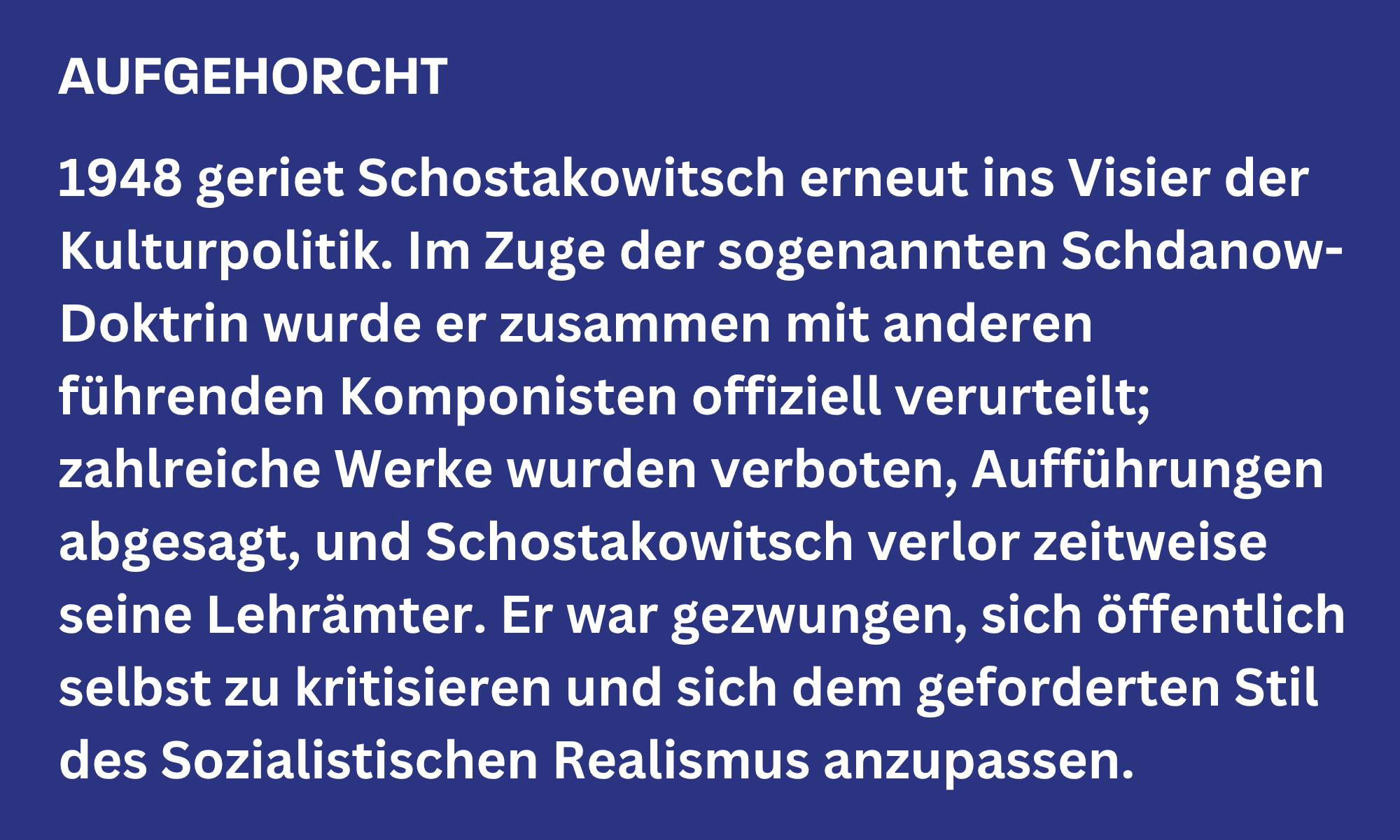 Er ist einer der folgenschwersten Verrisse einer Oper in der Musikgeschichte – und ein Wendepunkt im Leben von Dmitri Schostakowitsch. Mit dem Prawda-Artikel „Chaos statt Musik“ vom 28. Januar 1936 wurde nicht nur seine Oper „Lady Macbeth von Mzensk“ in Grund und Boden kritisiert, sondern auch das gesamte Werk und die Persönlichkeit des Komponisten: Maschinengewehrartig schießt dieser Artikel eine Demütigung nach der nächsten heraus: „Es ist dies ein linkes Chaos statt einer echten, menschlichen Musik. Die Kraft der Musik, die den Hörer mitreißen kann, wurde zugunsten kleinbürgerlicher und unfruchtbarer formalistischer Versuche und prätentiöser Bemühungen um Originalität mit Hilfe billigster Mittel verschleudert. Dieses Spiel kann aber böse enden.“ Der Prawda-Artikel ist nicht namentlich unterzeichnet, was bedeutet, dass er die offizielle Staatsdoktrin und somit die Stimme von Josef Stalin widerspiegelt. Der Diktator saß am Vorabend im Publikum des Bolschoi-Theaters und setzte dem bis dahin kontinuierlichen Erfolg von Dmitri Schostakowitsch ein jähes Ende. Quasi über Nacht wurde er zum Volksfeind. Mit der einsetzenden stalinistischen Terrorwelle lebte auch Schostakowitsch fortan in existenzieller Angst und der Ungewissheit. Diese Sorge war keinesfalls unbegründet: Mehrere Künstler aus seinem unmittelbaren Umfeld und eigene Angehörige wurden verhaftet oder exekutiert, die staatliche Willkür war unberechenbar.