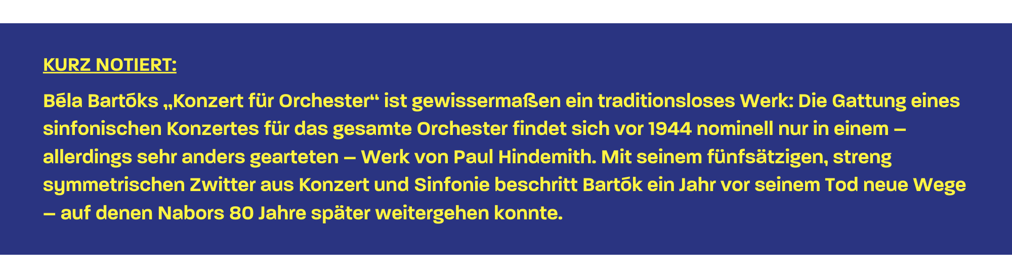 Ein „Concerto for Orchestra“ wollte Nabors schon länger komponieren. „Mein Ziel war es, nicht nur viele der kompositorischen Attribute, die Komponisten wie Bartók oder Lutosławski so gekonnt dargelegt haben, beizubehalten, sondern auch die grundlegenden Ideale dieses Genres mit meinen eigenen stilistischen und kulturellen Wurzeln zu verbinden.“