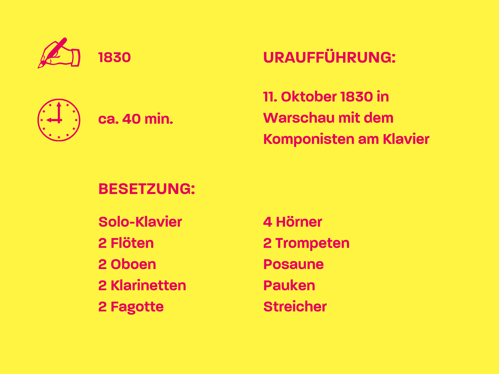 1829 begann Frédéric Chopin an seinem ersten Klavierkonzert f-Moll op. 21 zu arbeiten – noch vor dem später als „Nummer 1“ gezählten e-Moll-Konzert, das die Opuszahl 11 nur aufgrund der früheren Drucklegung erhielt. Die offizielle Premiere dieses zweiten Konzerts fand am 11. Oktober 1830 im Nationaltheater statt, zu einer Zeit, in der das Herzogtum Warschau (das seit dem Wiener Kongress 1815 unter russischer Herrschaft stand) ein einziger Gedanke erfüllte: die Befreiung von den Besatzern. Wegen der sich zuspitzenden politischen Krise verließ Chopin am 2. November 1830 seine Heimat für immer – gerade noch rechtzeitig, da am 11. November mit der Erstürmung des Belvederepalastes der sogenannte Kadettenaufstand begann, der die Unabhängigkeit Polens vom Russischen Kaiserreich zum Ziel hatte und bereits im folgenden Herbst blutig niedergeschlagen wurde.