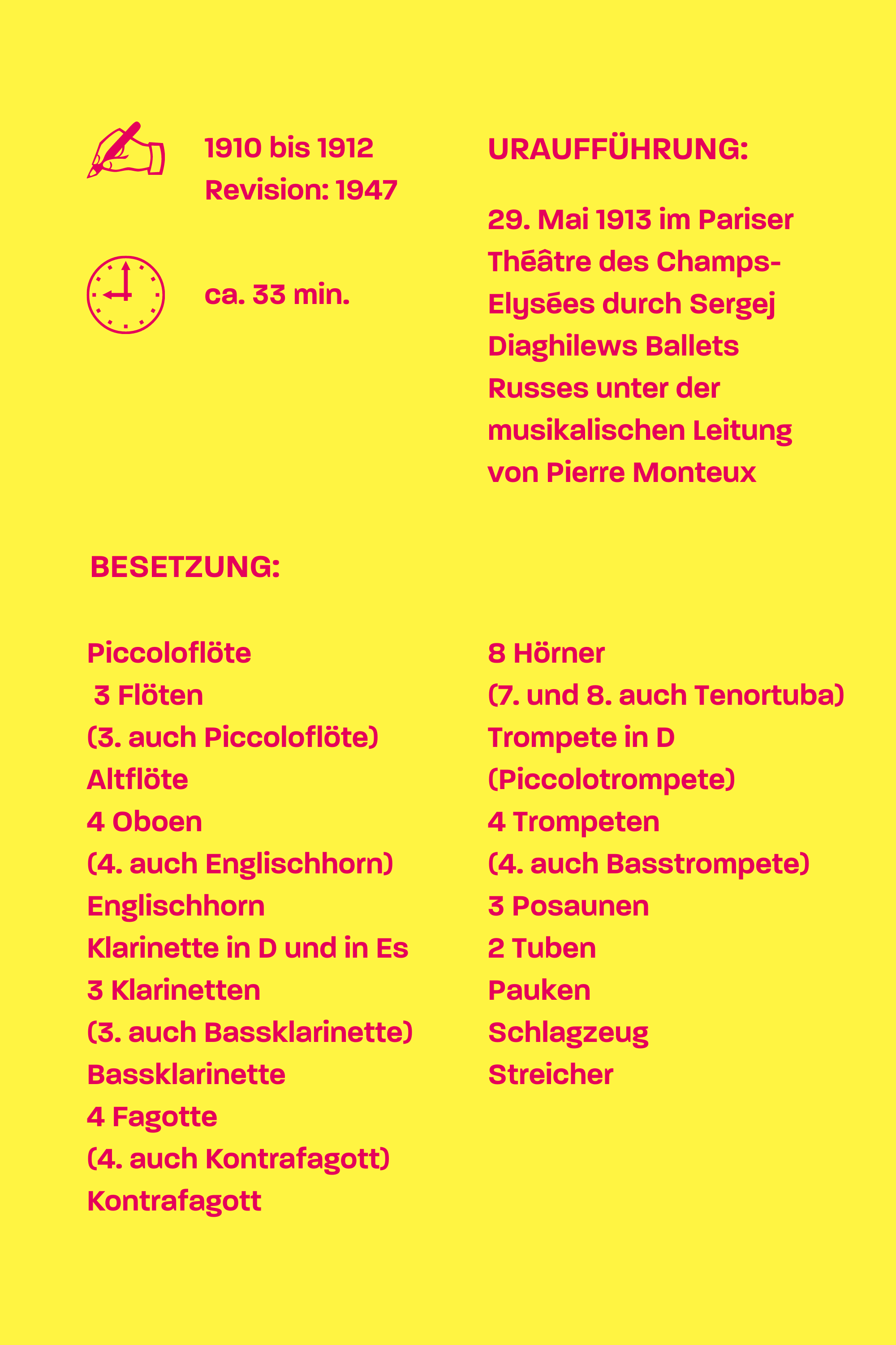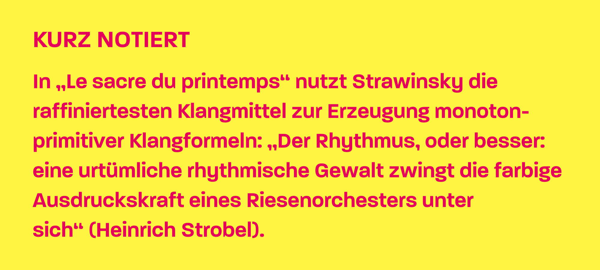 Die Ursachen für diese Irritationen lagen einerseits in dem Sujet begründet, ein archaisches Opferritual, um den Gott des Frühlings günstig zu stimmen, aufgrund dessen man Strawinsky blanken Sadismus vorwarf. Andererseits war es aber auch die Musik dieses Jahrhundertwerks, die zunächst auf Unverständnis stieß, vor allem deshalb, weil das rhythmische Element nicht nur neben Melodik und Harmonik gleichberechtigt behandelt wird, sondern den Grundklang der Musik und damit die gesamte Komposition bestimmt. Dass Strawinsky mit komplexesten Mitteln denkbar einfache Klangformeln erzeugte, erregte die Gemüter – wenn auch nicht lange, da das revolutionäre Werk bereits im April 1914 bei einer konzertanten Aufführung seinen endgültigen Durchbruch erlebte. Einer, der diesen Erfolg vorhergesehen hatte, war der Kritiker Jacques Rivière. Bereits im November 1913 schrieb er in der „Nouvelle Revue Française“: „Strawinsky sagt uns, dass er das Aufbranden des Frühlings schildern wollte. Aber dies ist nicht der übliche, von Dichtern besungene Frühling mit seinen linden Düften, seinem Vogelgezwitscher, seinem hellblauen Himmel und zarten Grün. Hier ist nichts als der erbarmungslose Kampf des Wachsens, das panische Entsetzen vor den aufsteigenden Säften, die beängstigende Umgruppierung der Zellen. Frühling von innen gesehen, mit all seiner Heftigkeit, seinen Spasmen und Rissen. Es ist, als beobachteten wir ein Drama unter einem Mikroskop.“