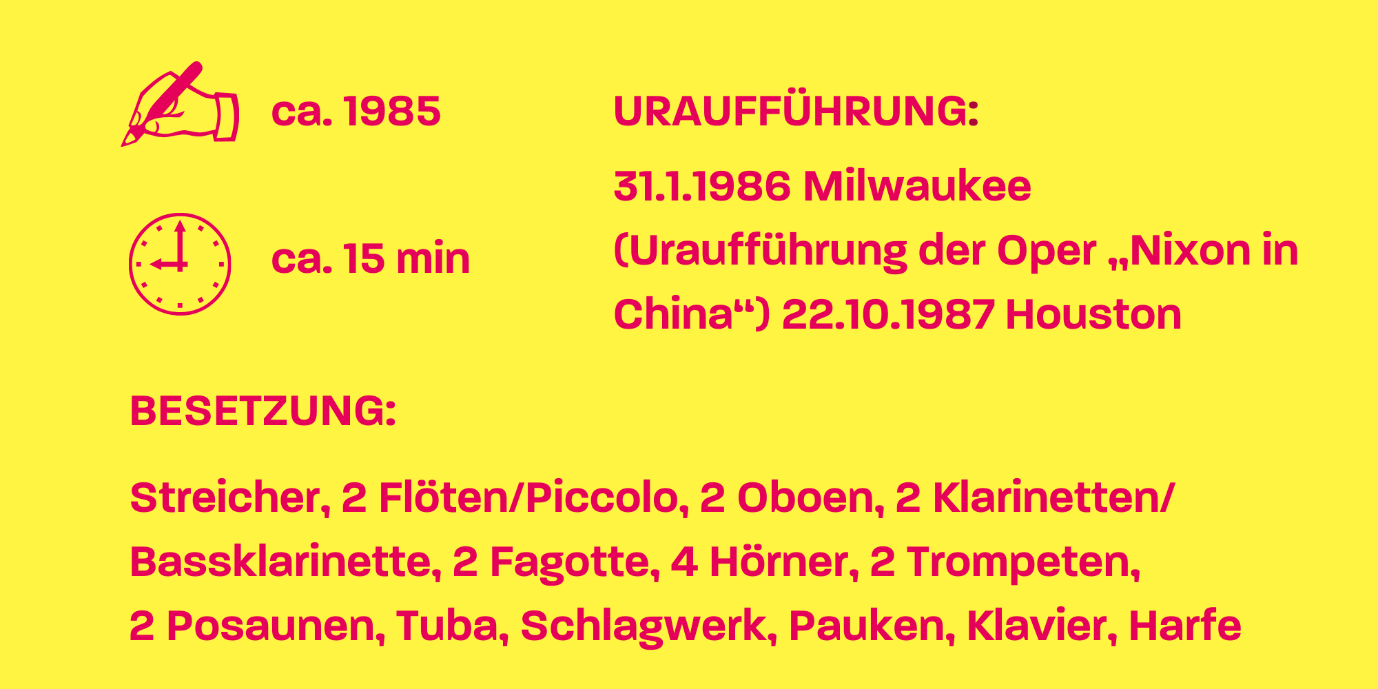 Zu hören ist diese Handschrift auch in seinem Stück „The Chairman dances“. Es stammt aus seiner ersten Oper „Nixon in China“, mit der er den ersten Staatsbesuch eines US-amerikanischen Präsidenten 1972 in der Volksrepublik China ironisch kommentierte – ein typisches Thema für den politisch interessierten Adams. 1987 wurde die Oper in Houston uraufgeführt. Das Wort „dances“ ist in diesem Fall als Verb zu verstehen, denn die Szene zeigt, wie die Ehefrau von Mao Zedong ein offizielles Bankett sabotiert und eine heiße Striptease-Nummer aufs Parkett legt. Der Große Vorsitzende selbst ist nur in Form eines monumentalen Gemäldes anwesend, doch bald hält er es nicht mehr aus und steigt aus dem Rahmen, um mit seiner Frau einen Foxtrott zu tanzen.