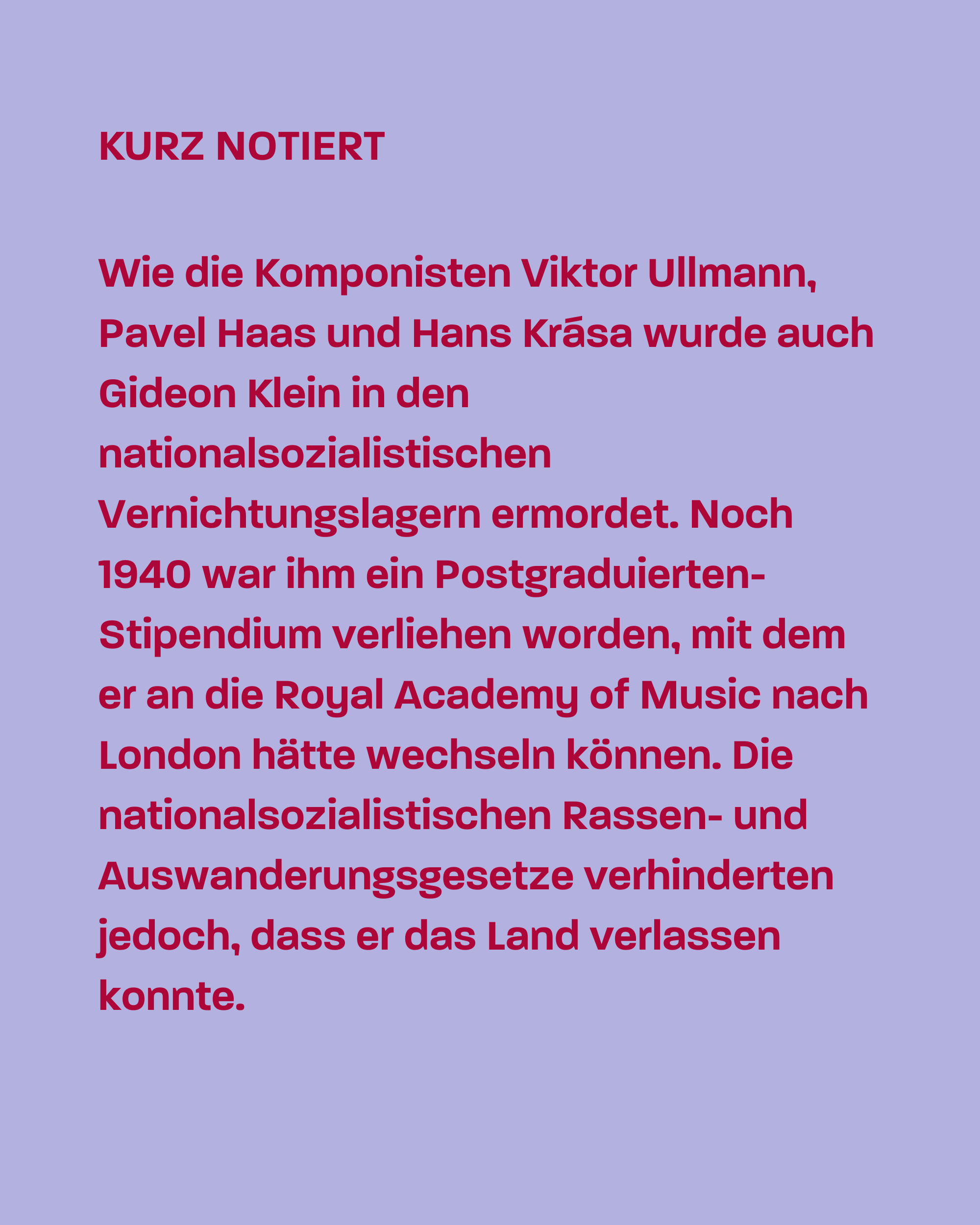 Gideon Klein stand am Anfang seiner Musikerlaufbahn, als er Anfang Dezember 1941 zusammen mit Tausenden anderen Prager Juden nach Theresienstadt deportiert wurde. Seine Pianistenausbildung in der Meisterklasse von Vilem Kurz hatte der junge Musiker Anfang 1939 noch mit Auszeichnung abschließen können. Das Musikwissenschafts- und Philosophiestudium an der Karlsuniversität musste er allerdings abbrechen – ebenso wie den Kompositionskurs beim renommierten „Vierteltonkomponisten“ Alois Hába: Nach der Besetzung der Tschechoslowakei durch deutsche Truppen im März 1939 war jüdischen Studenten im „Protektorat Böhmen und Mähren“ jede Ausbildung verboten worden.