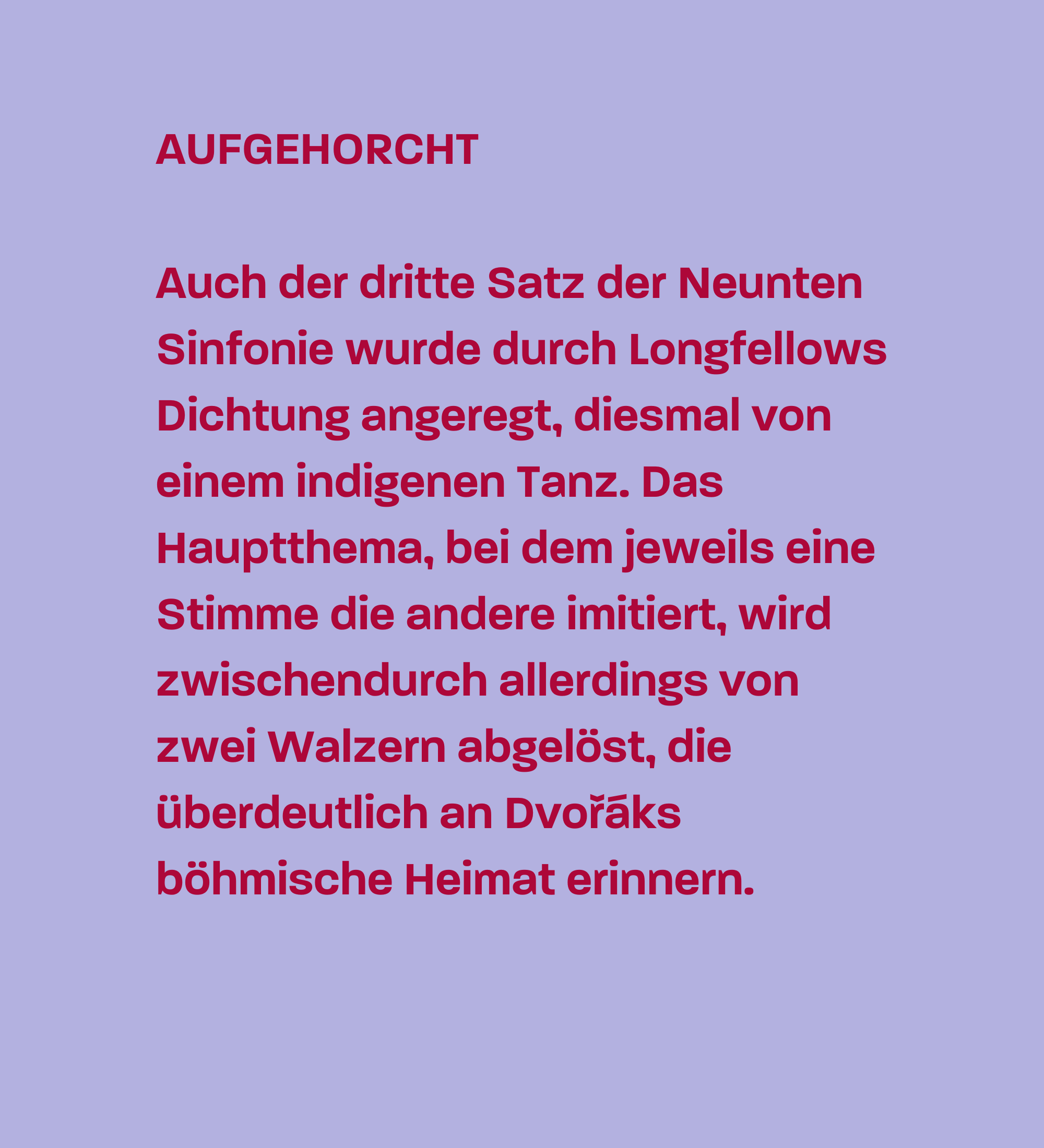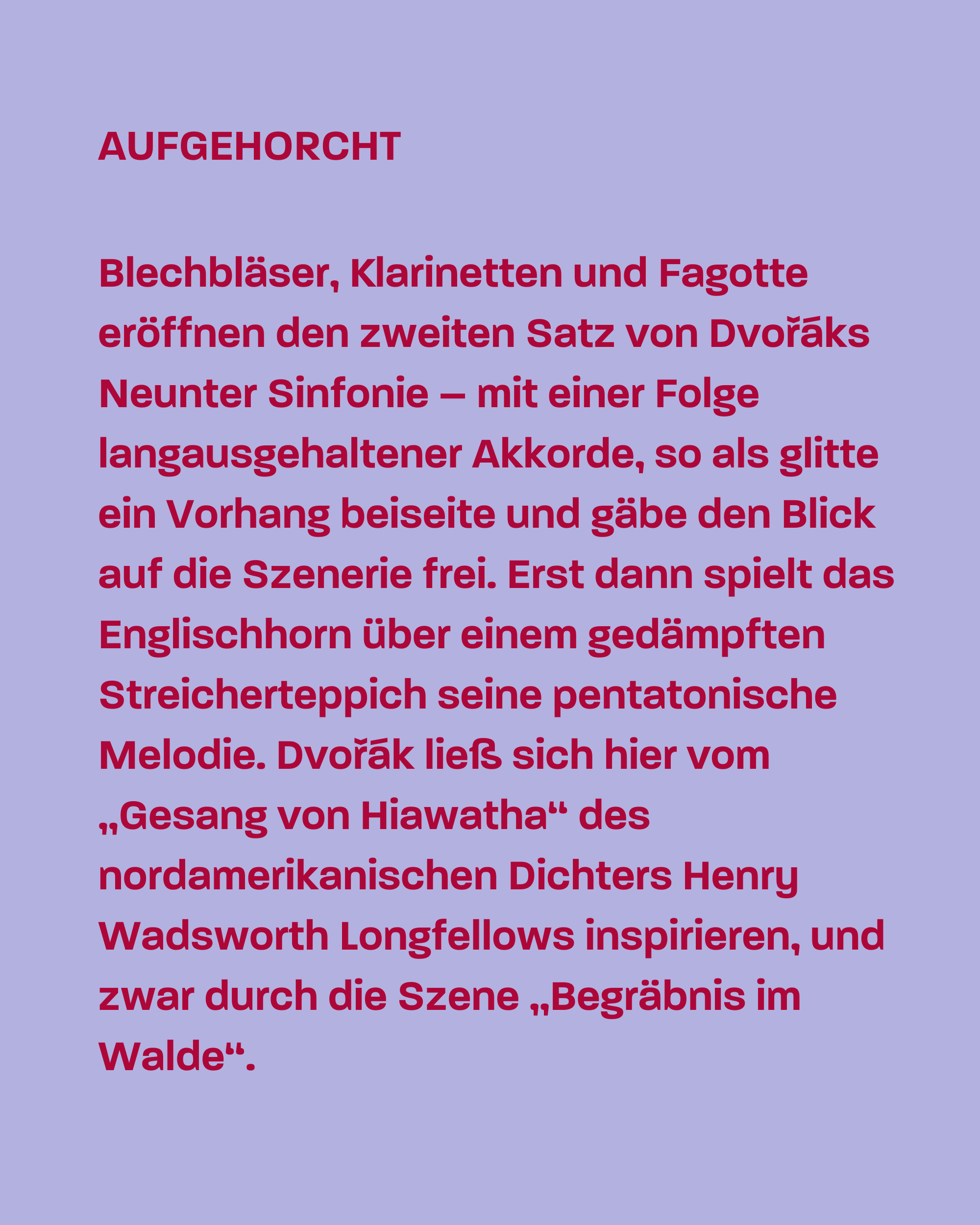 Folkloristisch sollte Antonín Dvořáks Neunte Sinfonie klingen. Schließlich war der Komponist zwecks Schaffung einer typisch „amerikanischen“ Nationalmusik zum Direktor des New Yorker National Conservatory of Music berufen worden: „Die Amerikaner“, schrieb er, „erwarten große Dinge von mir, vor allem soll ich ihnen den Weg ins gelobte Land und in das Reich der neuen, selbstständigen Kunst weisen […].“ Dvořák erforschte die musikalischen Wurzeln des neuen Kontinents – die afroamerikanische und indigene Folklore ebenso wie die traditionellen Lieder eingewanderter Iren und Schotten. Es dauerte nicht lange, da hatte er die Arbeit an einer neuen Sinfonie abgeschlossen, in der er erklärtermaßen versucht hatte, „Charakteristika zu porträtieren, welche deutlich amerikanisch sind.“ Und wirklich: Nach der triumphalen Premiere des Werks am 15. Dezember 1893 war sich die New Yorker Kritik einig: Sie hatten den Beginn der „amerikanischen Kunstmusik“ erlebt. In der „New York Times“ war unter der Schlagzeile „Die Sinfonie ‚Aus der Neuen Welt‘, eine Studie nationaler Musik“ zu lesen, das Werk sei eine „Lehre für die amerikanischen Komponisten“. Dvořák habe ein Stück Musik geschaffen, dessen „Themen durchdrungen sind vom Geiste der Spiritual- und Indianermelodien. Es ist eine Sinfonie, erfüllt von amerikanischen Gefühlen.“
