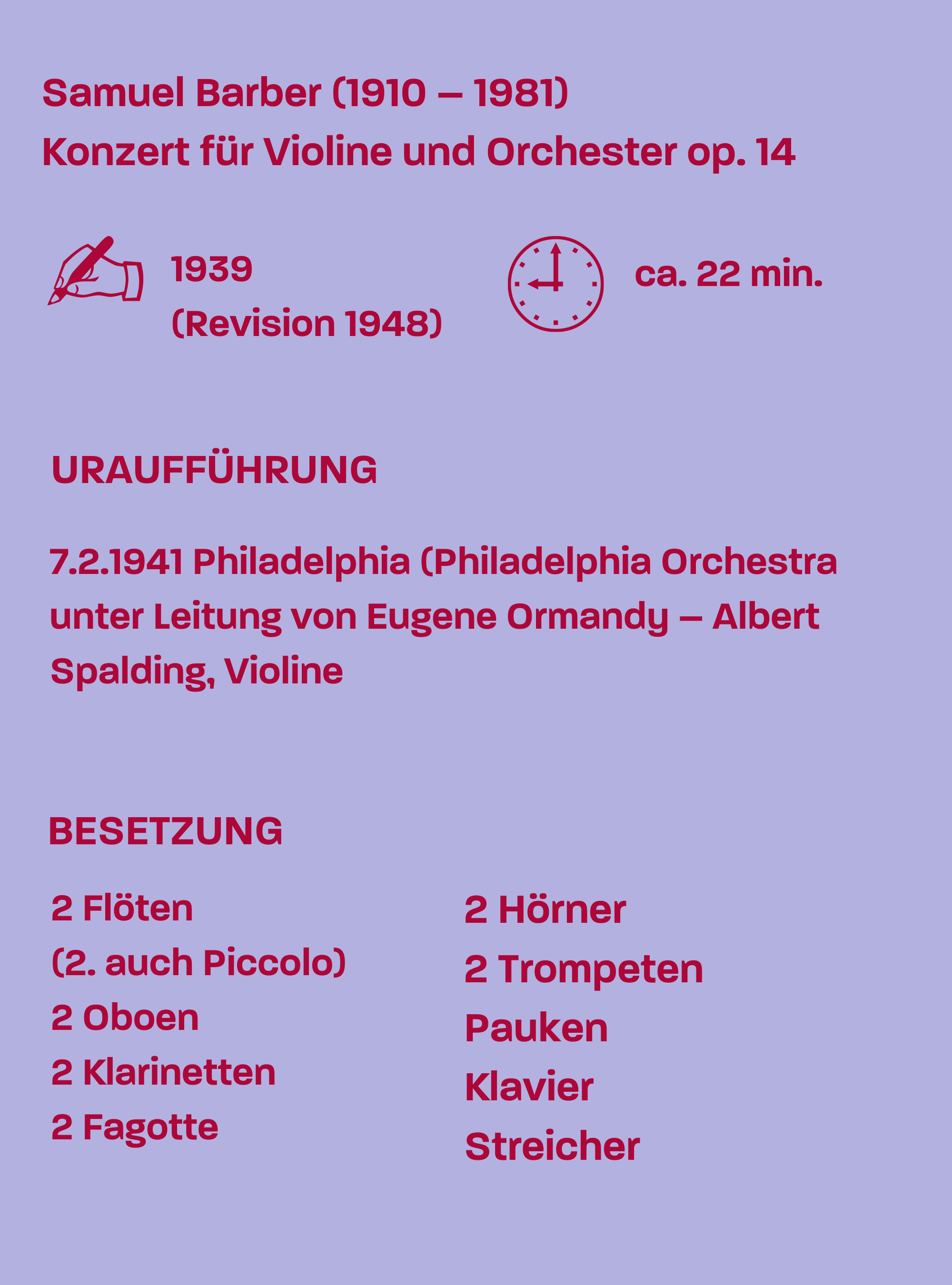 Die Premiere war für Januar 1940 angesetzt, doch es sollte anders kommen. Denn Briselli, der die ersten beiden Sätze noch in höchsten Tönen gelobt hatte, war von dem technisch hoch anspruchsvollen, aber recht kurzen Perpetuum-mobile-Finale – „Es ist schwierig, dauert aber nur vier Minuten“ (Barber) – wenig begeistert. Hierin bestärkt wurde er von seinem Lehrer Albert Meiff, der zu Protokoll gab, das Konzert sei „kein Stück für den Konzertsaal mit großem Orchester“ und erinnere an „ein kleines Körbchen mit zierlichen Blumen zwischen hohen Kakteen in der weiten Prärie“. Als Barber es ablehnte, Änderungen vorzunehmen, gab Briselli das Konzert zurück, wobei der Komponist seinen 500-Dollar-Vorschuss behalten konnte. Im Sommer zeigte Barber dem amerikanischen Geiger Albert Spalding die Noten, der sofort Feuer und Flamme war. Nach der offiziellen Uraufführung am 7. und 8. Februar 1941 mit wiederholten Konzerten in New York und Washington D.C. avancierte Barbers Violinkonzert zu einem der am häufigsten aufgeführten Werke der Konzertliteratur. Kein Wunder – handelt es sich doch um ein ungemein melodiöses Stück, dessen Nähe zur Romantik unüberhörbar ist, in dem Barber aber dennoch zu einer ganz eigenen, unverwechselbaren Klangsprache gefunden hat.
