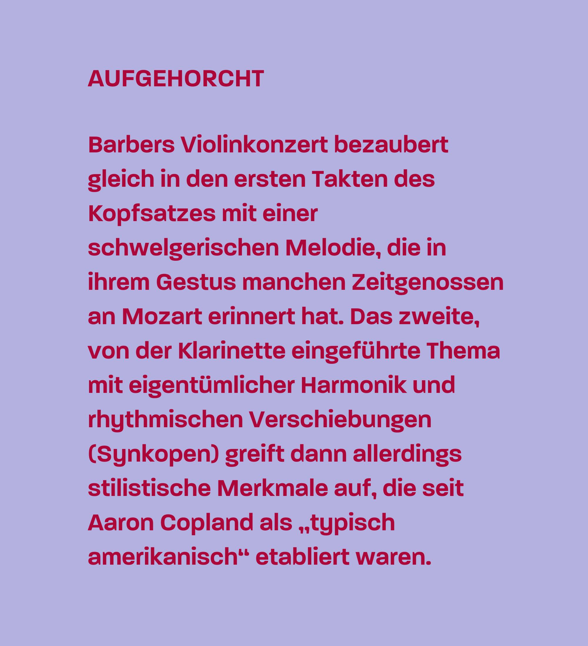 Davon, mit der Zeit zu gehen, hielt Samuel Barber wenig: „Ich mache einfach, wie man so sagt, mein Ding“, sagte er 1971 in einem Interview – und ergänzte umgehend, dass „das einen gewissen Mut“ erfordern würde. Denn Barber, der schon mit neun Jahren seiner Mutter erklärte, dass er Komponist werden wollte, schrieb zeit seines Lebens eine Musik, die der Tonalität und dem Geist der Spätromantik verpflichtet blieb – handwerklich perfekt gearbeitet und mit einer besonderen Vorliebe für expressive Melodien, womit er frühzeitig zu einem der erfolgreichsten US-amerikanischen Tonsetzer des 20. Jahrhunderts avancierte. Seine Erste Sinfonie, deren gefeierte Premiere am 13. Dezember 1936 stattfand, vollendete Barber als Gewinner des amerikanischen Rom-Preises an der American Academy. Bereits ein Jahr später setzte Artur Rodziński als damaliger Musikdirektor des Cleveland Orchestra das Werk bei den Salzburger Festspielen aufs Programm – als das erste Stück eines amerikanischen Komponisten, das dort gespielt wurde. Arturo Toscanini, der sich im Publikum befand, war so begeistert, dass er Barber um ein Werk für sein neu gegründetes NBC Symphony Orchestra bat – eine Chance, die sich der Komponist natürlich nicht entgehen ließ, wobei Toscanini gleich zwei Stücke bekam: das Adagio for strings sowie den First Essay for Orchestra. Toscanini dirigierte Anfang November 1938 die Uraufführung beider Werke, was den jungen Curtis-Institute-Absolventen über Nacht berühmt machte: Das Adagio avancierte in kürzester Zeit zum populären „Klassiker“ der amerikanischen Moderne – der Satz, so Barber, sei schlicht „eine Wucht“.