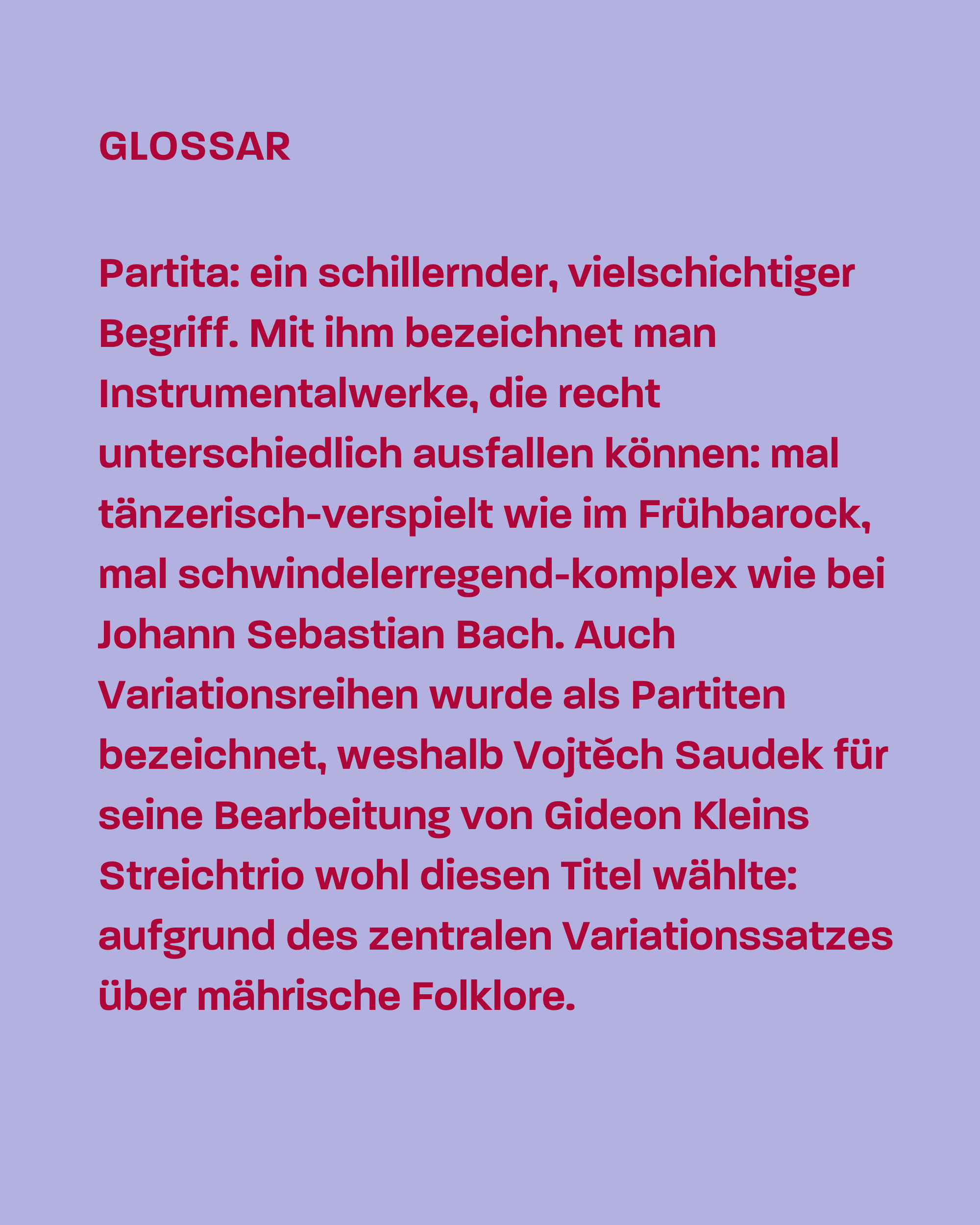Neun Tage nach Vollendung des Streichtrios wurde der 25-jährige Gideon Klein am 1. Oktober 1944 nach Auschwitz und von dort nach Fürstengrube gebracht, einem Arbeitslager in der Nähe vom polnischen Kattowitz. Ob er dort von den Nazis getötet wurde, als die Rote Armee vorrückte, oder auf einem der Todesmärsche sein Leben ließ, ist nicht bekannt. Seine von der Schwester geretteten Theresienstädter Werke wurden zusammen mit dem 1990 zufällig wiederentdeckten Vorkriegsschaffen zum Bestandteil des heutigen Musiklebens, wozu auch Vojtěch Saudeks Streichtrio-Bearbeitung beigetragen hat, die unter dem Titel Partita veröffentlicht wurde. Dass Saudek dieses Arrangement anfertigte, hatte mehrere Gründe: „[…] einmal das Bedauern, dass es Klein zeitlich nicht mehr vergönnt war, Orchesterwerke zu schreiben, zum anderen die Gewissheit, dass das Trio in der Bearbeitung für Streichorchester sehr gut klingen würde, und schließlich das Vorbild von Komponisten, die nicht zögerten, ihre Kammermusikwerke für Streichorchester zu bearbeiten (A. Berg, D. Schostakowitsch u.a.m.)“.
