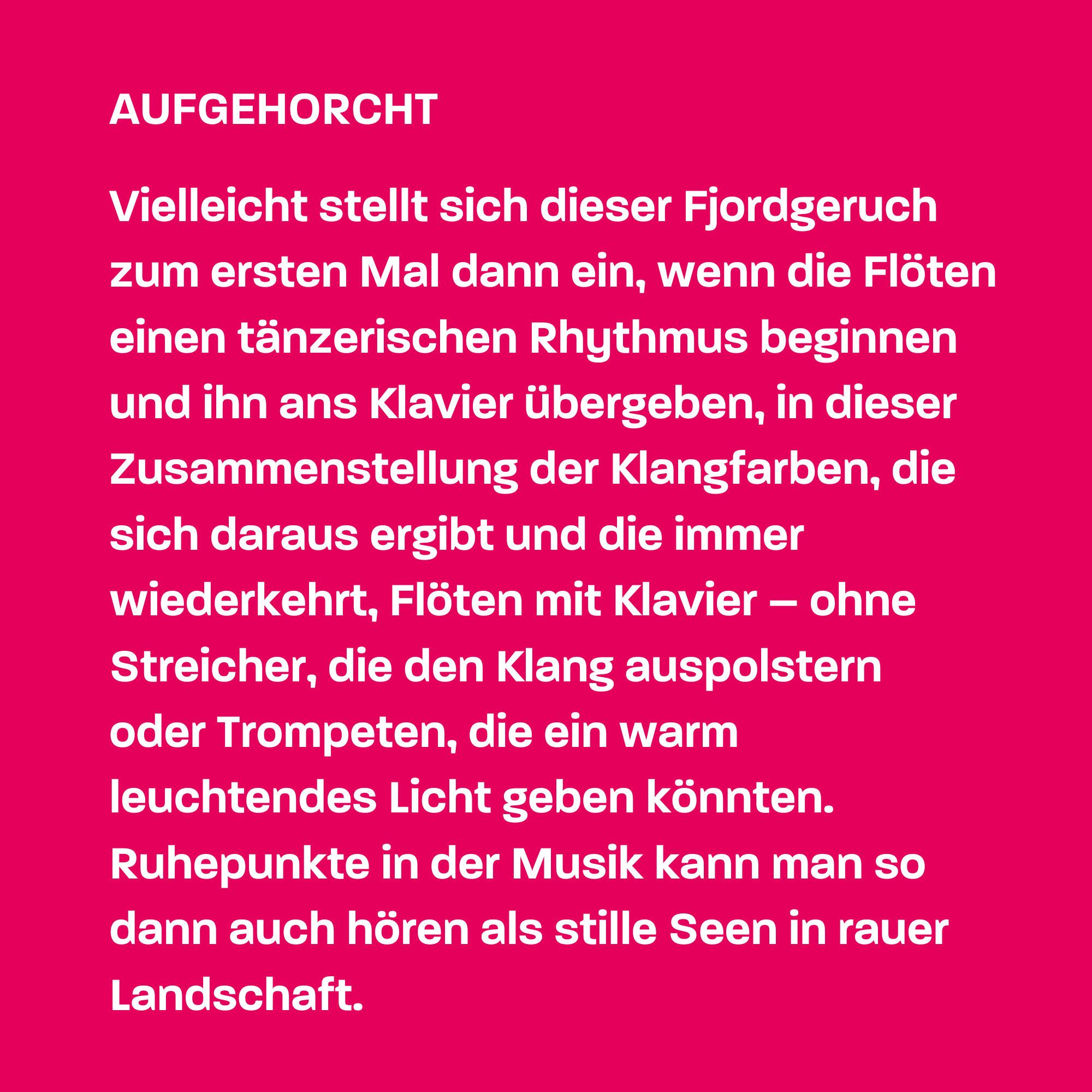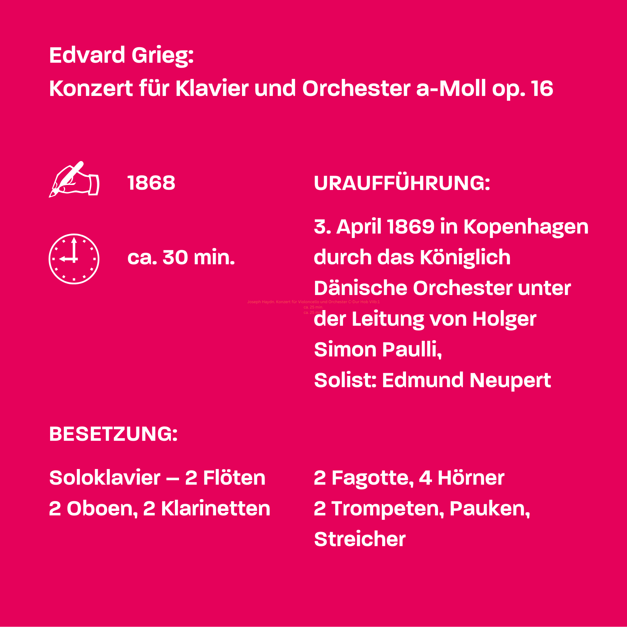 Denn so ähnlich startet er ein paar Jahre später direkt in sein eigenes Klavierkonzert: mit herabstürzenden Akkorden im Fortissimo, in der gleichen Tonart, a-Moll, und auch sonst lassen sich Ähnlichkeiten finden. Zum Zeitpunkt der Komposition ist Grieg längst nicht mehr in Leipzig. Damals besucht er seine Schwiegereltern, präsentiert zusammen mit seiner Frau die neugeborene Tochter. Mit diesem Wissen kann man auch den Überschwang eines jungen Vaters ins Konzert hineinhören, wenn man will, in diese Vollgriffigkeit auf den Tasten, in die Zartheit der melodischen Einfälle. Aber man kann genauso, wenn man es denn wünscht, in den Klangfarben die Weite Norwegens erahnen, sogar, wie der Pianist Herbert Schuch es einmal ausdrückte, einen „Fjordgeruch" wahrnehmen.