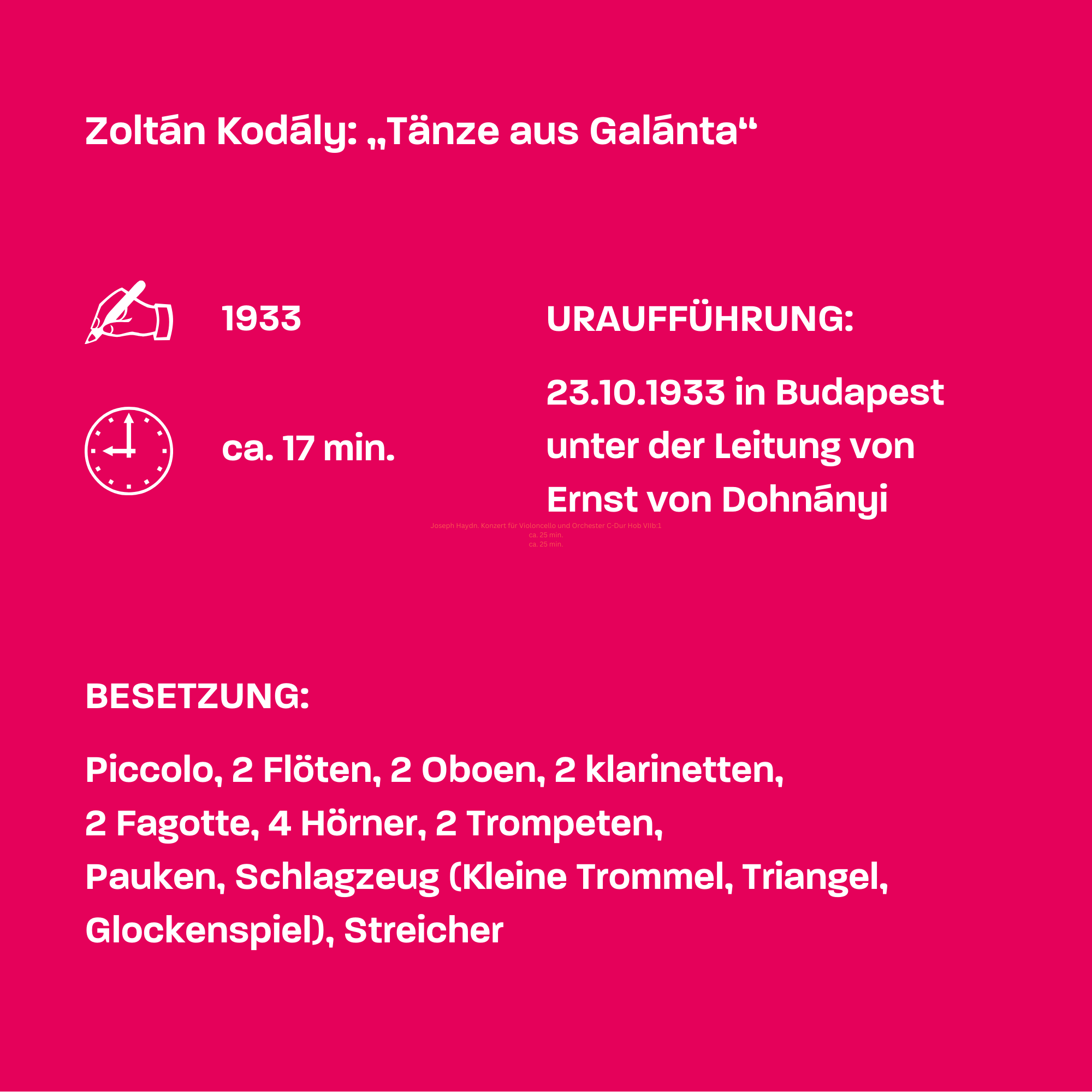 Der junge Kodály mag einen Ausflug an den Fluss Waag gemacht haben. Die Waag führt oft ruhiges Wasser, auf dessen Oberfläche kann man gut versuchen, flache Kiesel springen zu lassen. Danach mag er, Quellen berichten von einem lauen Sommertag, durch die Gassen von Galánta gelaufen sein, So läuft er zwischen den pastellfarbenen k.u.k-Fassaden der Häuser entlang und hockt sich schließlich in der Nähe eines Gasthauses hin. Musiker spielen auf, Menschen singen, tanzen. Zum ersten Mal nimmt er einen orchestralen Klang wahr, so beschreibt Kodály es selbst im Programmheft zur Uraufführung der „Tänze aus Galánta". Er meint allerdings kein Sinfonieorchester, so wie wir es heute Abend hören. Er bezieht sich auf eine Musikgruppe von Sinti und Roma. Sie spielen Tänze in halsbrecherischer Geschwindigkeit und langsamere Tänze mit herzzerreißend melancholischen Melodien.