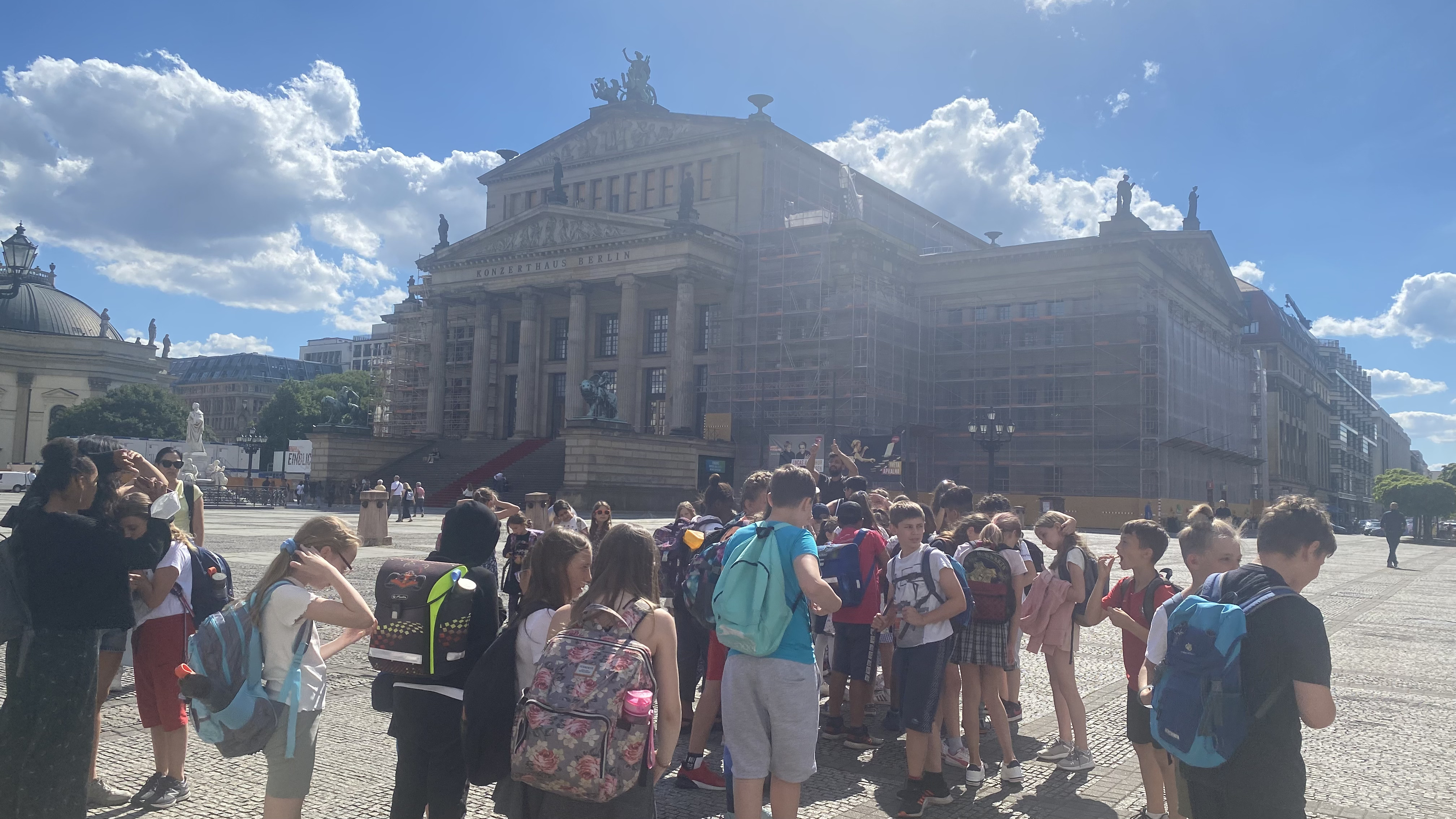 Aus dem Klassenzimmer per Bus an den Gendarmenmarkt – Kinder der Al-Farabi Musikakademie auf dem Weg zur Probe.