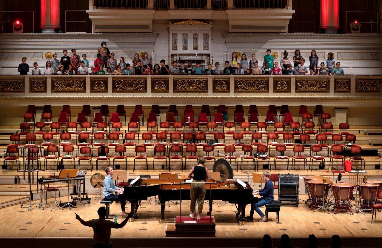 Hohe Konzentration bei der ersten gemeinsamen Probe aller Beteiligten im Großen Saal: Die Kinderchöre der Al-Farabi Musikakademie und der Chor der Humboldt-Universität treffen hier auf die Schlagzeuger des Konzerthausorchesters samt Gästen, unsere Artists in Residence Lucas und Arthur Jusssen und die Gesangssolist*innen!