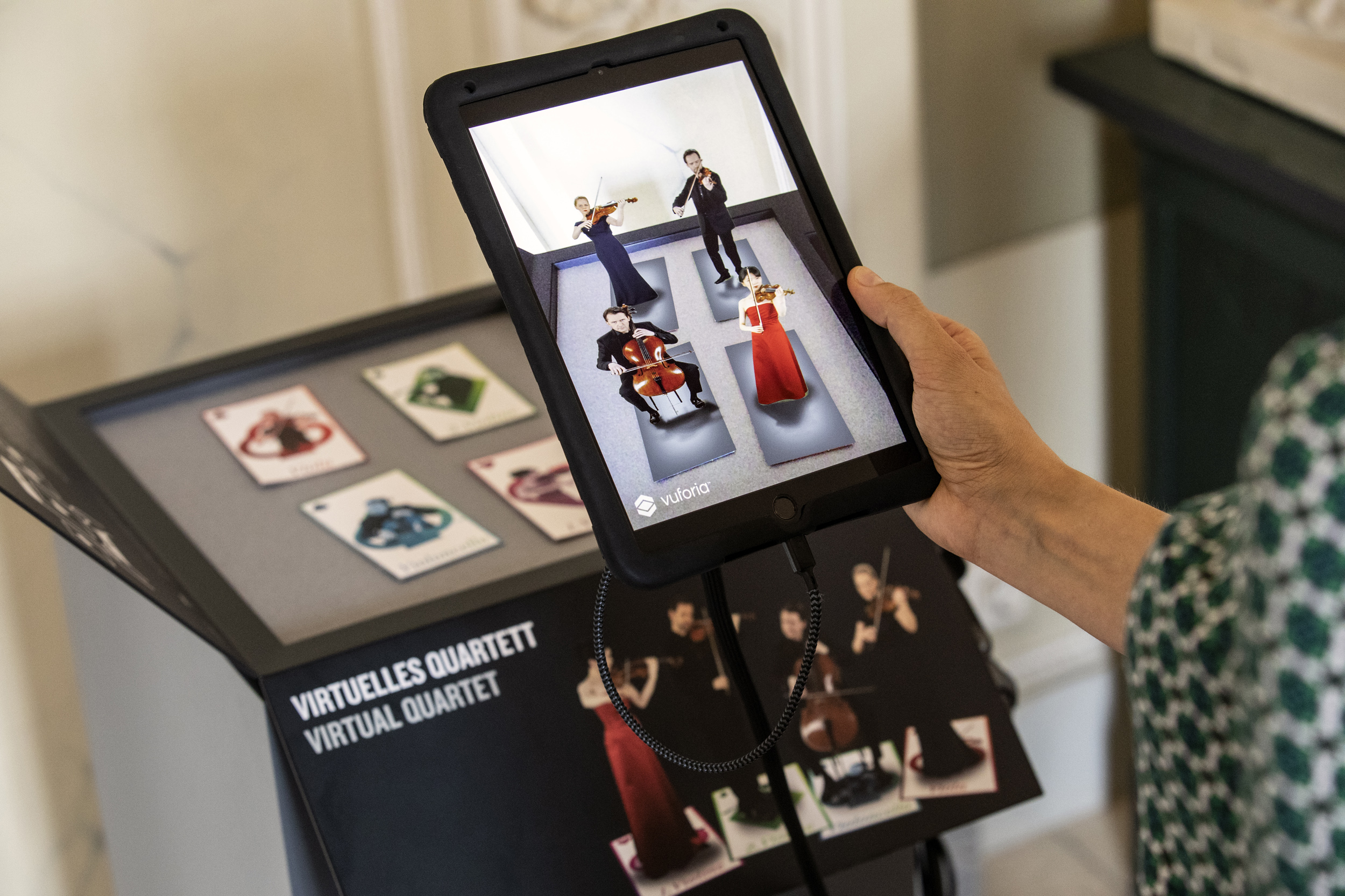 About a year after the project started, the Konzerthaus Berlin published the augmented reality app “Konzerthaus Plus” in 2017. The first augmentations could be found in the 2017/18 season brochure with an interactive sound map of the Baltic States, photo galleries, musical excerpts and 3D models. Digitally enhanced postcards, an orchestra puzzle and a virtual timeline followed. Probably the most extensive project, in addition to a high-quality 3D model of the Konzerthaus and five of its halls, is the “Virtual Quartet”.