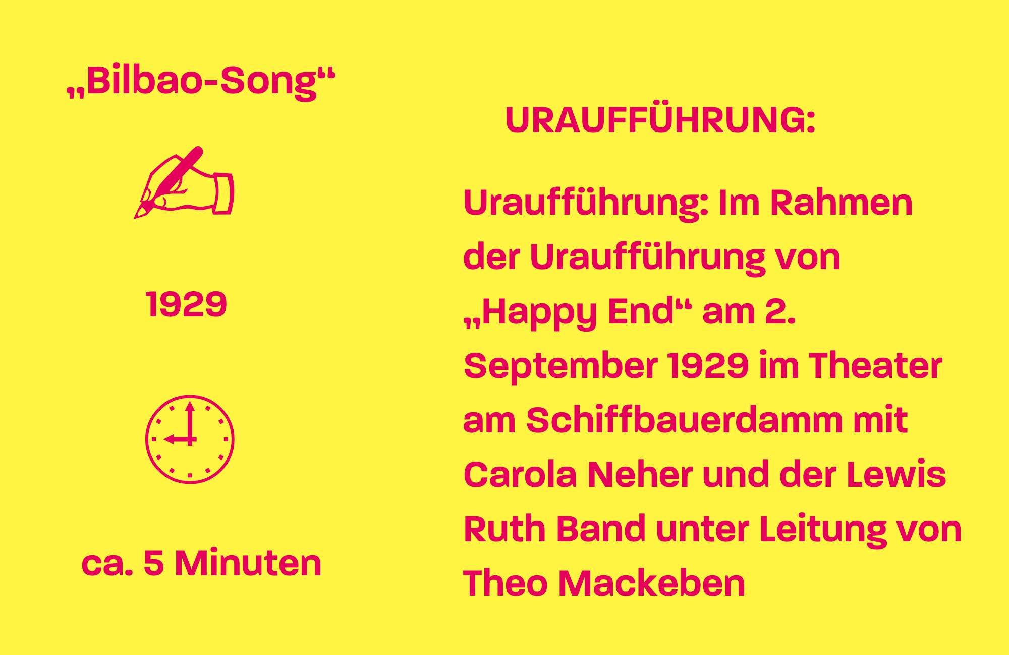 Mit dem ein Jahr nach der „Dreigroschenoper“ herausgekommenen „Happy End“ versuchte das Team um Brecht und Weill, an deren Erfolg anzuknüpfen. Freilich erwies sich diese Gangster- und Heilsarmeegeschichte auf der Bühne als kaum lebensfähig. Allerdings gehören die Songs zu den stärksten Schöpfungen von Brecht und Weill, darunter auch der „Bilbao-Song“.
