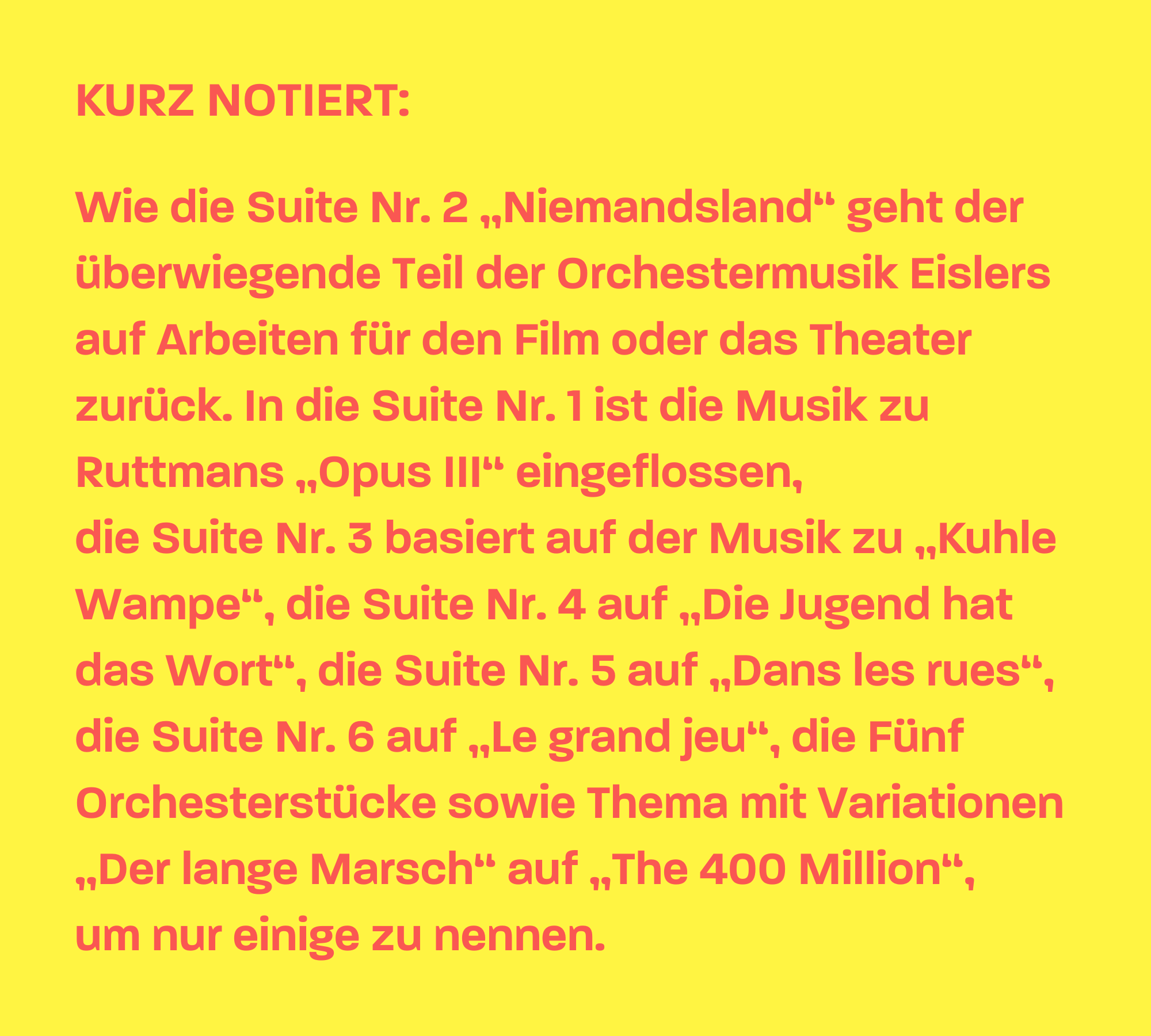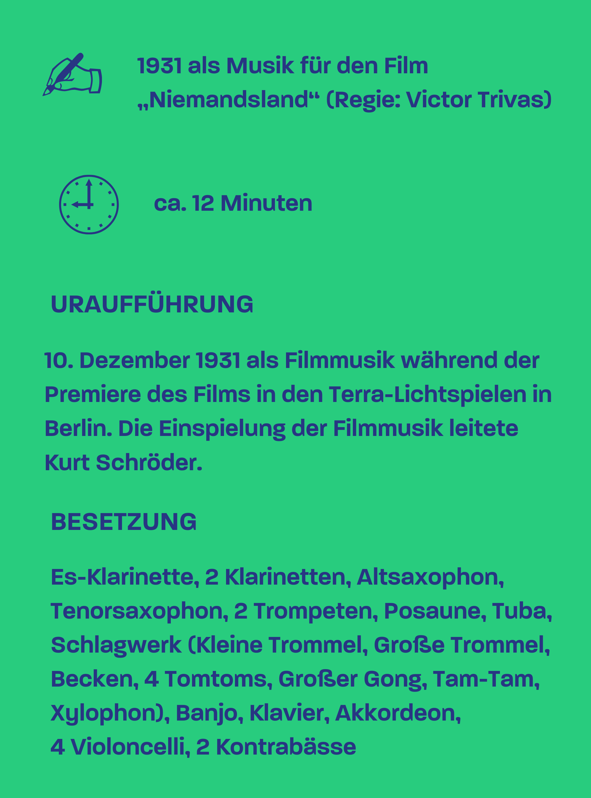 Hanns Eisler war schon als junger Mensch politisch engagiert. Als 14-jähriger trat er der Organisation der sozialistischen Mittelschüler bei, musste als Soldat im ersten Weltkrieg aufgrund seiner Überzeugungen Schikanen über sich ergehen lassen und erfuhr die Not der Nachkriegsjahre am eigenen Leibe. Diese Erfahrungen dürften ihn ebenso geprägt haben wie der Unterricht bei Arnold Schönberg, der das Talent des jungen Mannes erkannt hatte und ihn zwischen 1919 und 1924 unentgeltlich unterrichtete. Mitte der zwanziger Jahre allerdings kam es zum Bruch zwischen Lehrer und Schüler. Anders als für Schönberg wurde für Eisler die Frage nach der sozialen Funktion der Musik bestimmend. Er wandte sich zunehmend vom bürgerlichen Musikbetrieb ab und entwickelte in den Jahren um 1930 sein Konzept einer „angewandten Musik“, die im politischen Kampf eine aufklärerische, agitatorische, aktivierende Funktion haben konnte und prägte den ihm eigenen Kampfmusik-Stil aus, der musikalische Intelligenz mit der Möglichkeit zu breitester Wirksamkeit verband. Von Anbeginn an hatte Eisler ein starkes Interesse am Film, insbesondere am damals gerade aufkommenden Tonfilm, mit dem ein breites Publikum erreicht werden konnte. Schon 1927 hatte er eine Musik zum abstrakten Stummfilm „Opus III“ von Walther Ruttmann komponiert, nun aber waren es Spielfilme, zu denen er Musik schrieb, und die wollten nicht unterhalten, sondern die Wirklichkeit jener Zeit kritisch spiegeln: In „Kuhle Wampe oder: Wem gehört die Welt?“ (1932) ging es um die sozialen Folgen der Weltwirtschaftskrise. Schon ein Jahr zuvor kam „Niemandsland“ in die Kinos, ein Antikriegsfilm, dessen Handlung im Ersten Weltkrieg angesiedelt ist.