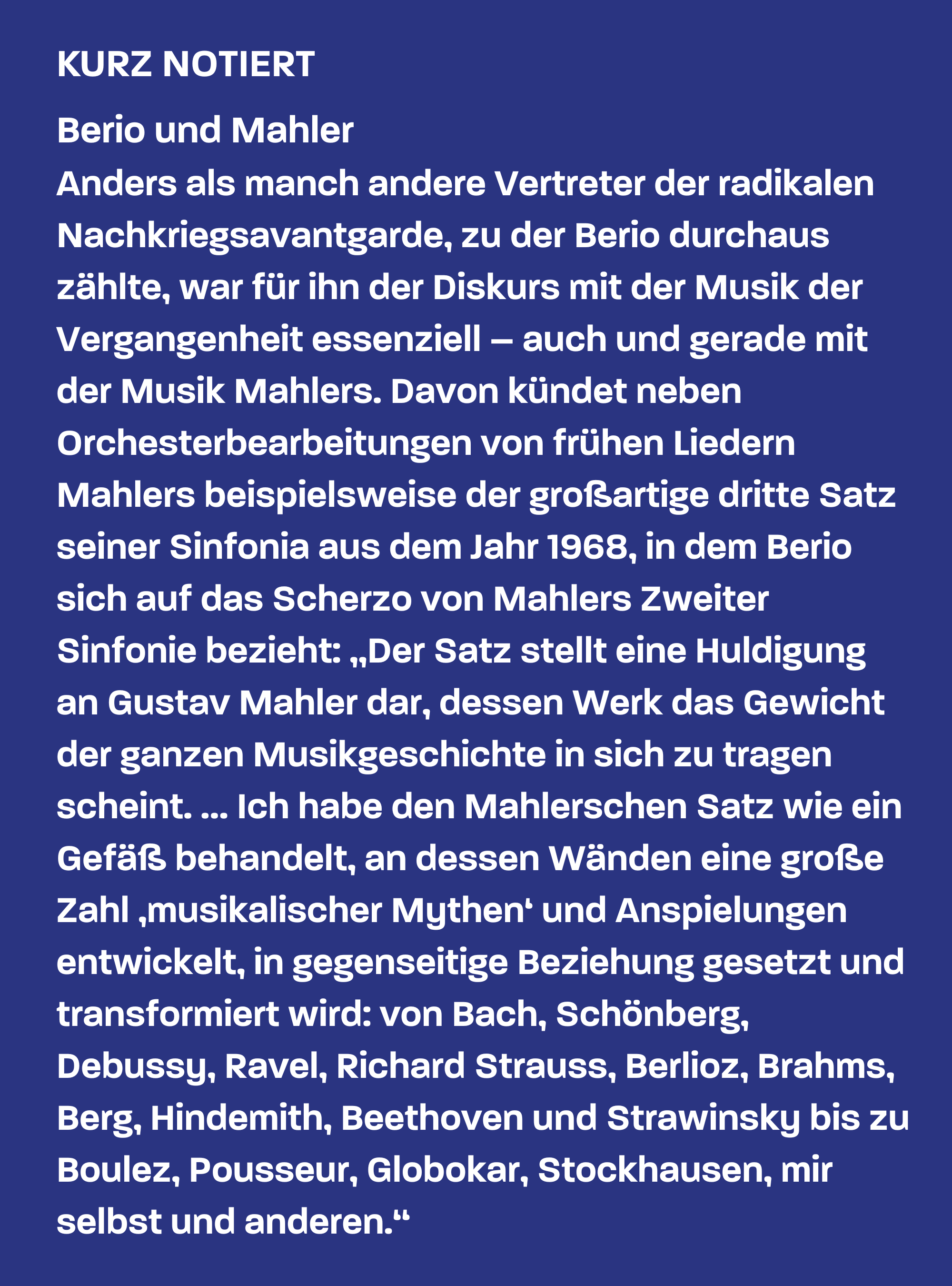 Der Marsch aber ist auch jenes Element, das Mahlers Sechste mit Luciano Berios Orchesterwerk „Eindrücke“ verbindet, denn ein merkwürdig verfremdeter Marsch ist dort von Anfang bis Ende mehr oder minder präsent