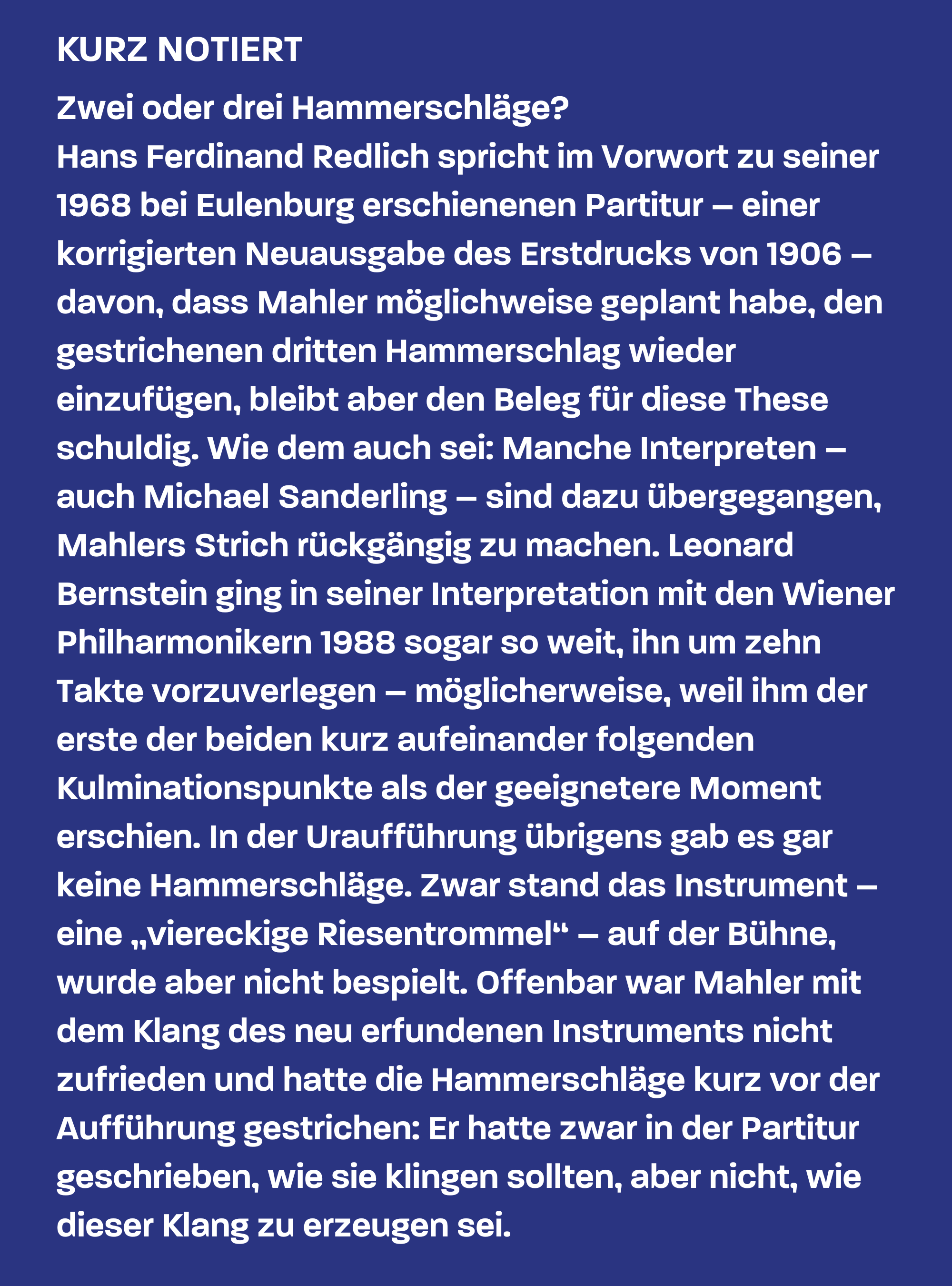 „Alles mit roher Kraft“ lautet die Vortragsbezeichnung einer Steigerungspassage im Finale von Mahlers Sechster Sinfonie. Dort allerdings, wo man als deren Ergebnis das Erreichen eines Höhepunktes erwartet, fällt ein Schlag ins Leere. Was folgt, ist ein tumultuös losbrechender Marsch mit wirbelnden Figuren und geschmetterten Fanfaren, vorangepeitscht von den Schlägen der Rute.