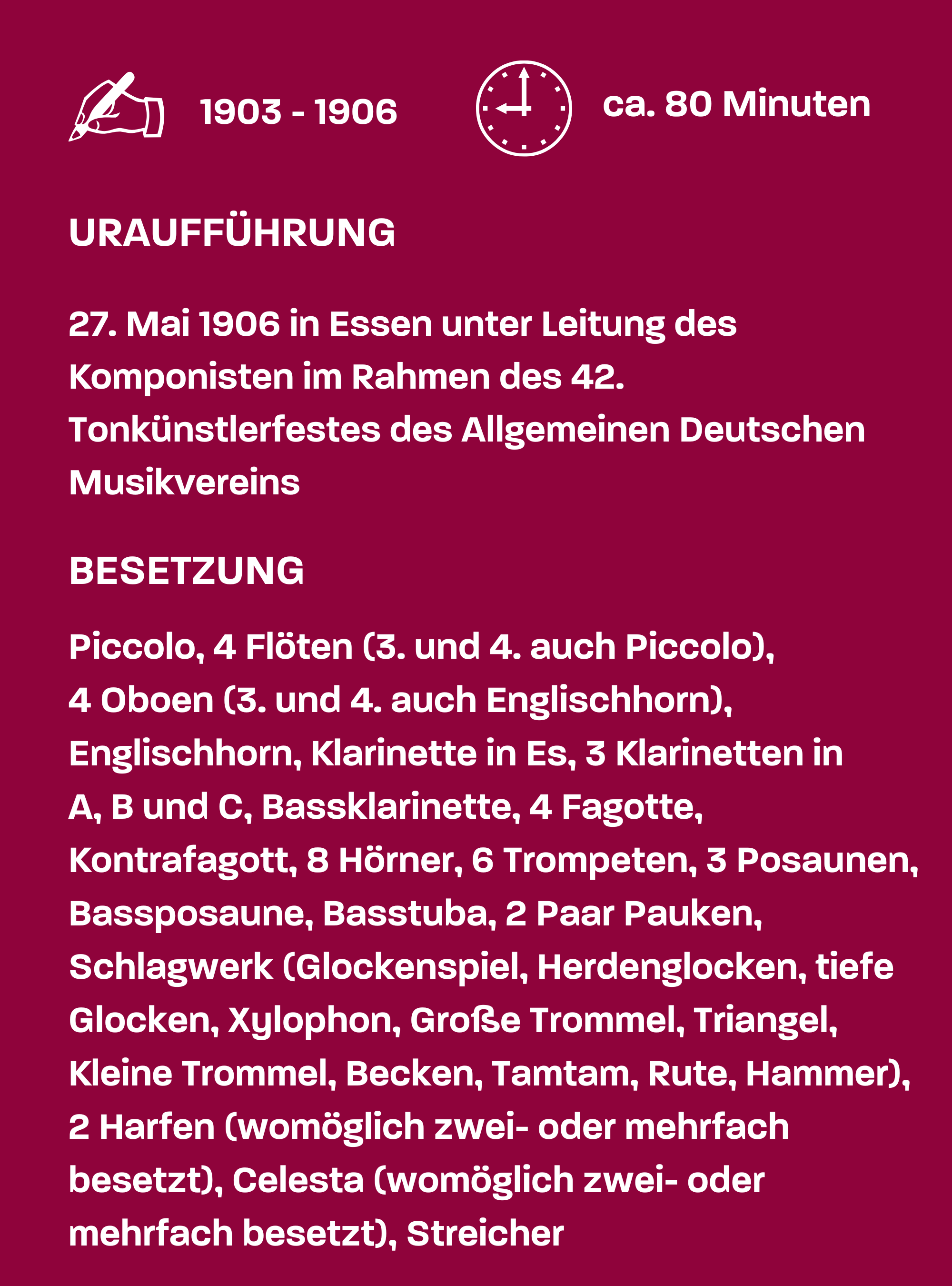 In Mahlers Sinfonien finden sich allenthalben Marschcharaktere – angefangen vom parodistischen „Todtenmarsch in Callot‘s Manier“ der Ersten Sinfonie über den Marsch, der in der endzeitlichen Vision des Finales der Zweiten die Toten zum „großen Appell“ versammelt, den pantheistischen Einmarsch des Sommers in der Dritten, den eröffnenden Trauermarsch der Fünften Sinfonie, die surreal verzauberten Märsche der Siebenten bis hin zum Kondukt gegen Ende des Kopfsatzes der Neunten Sinfonie.