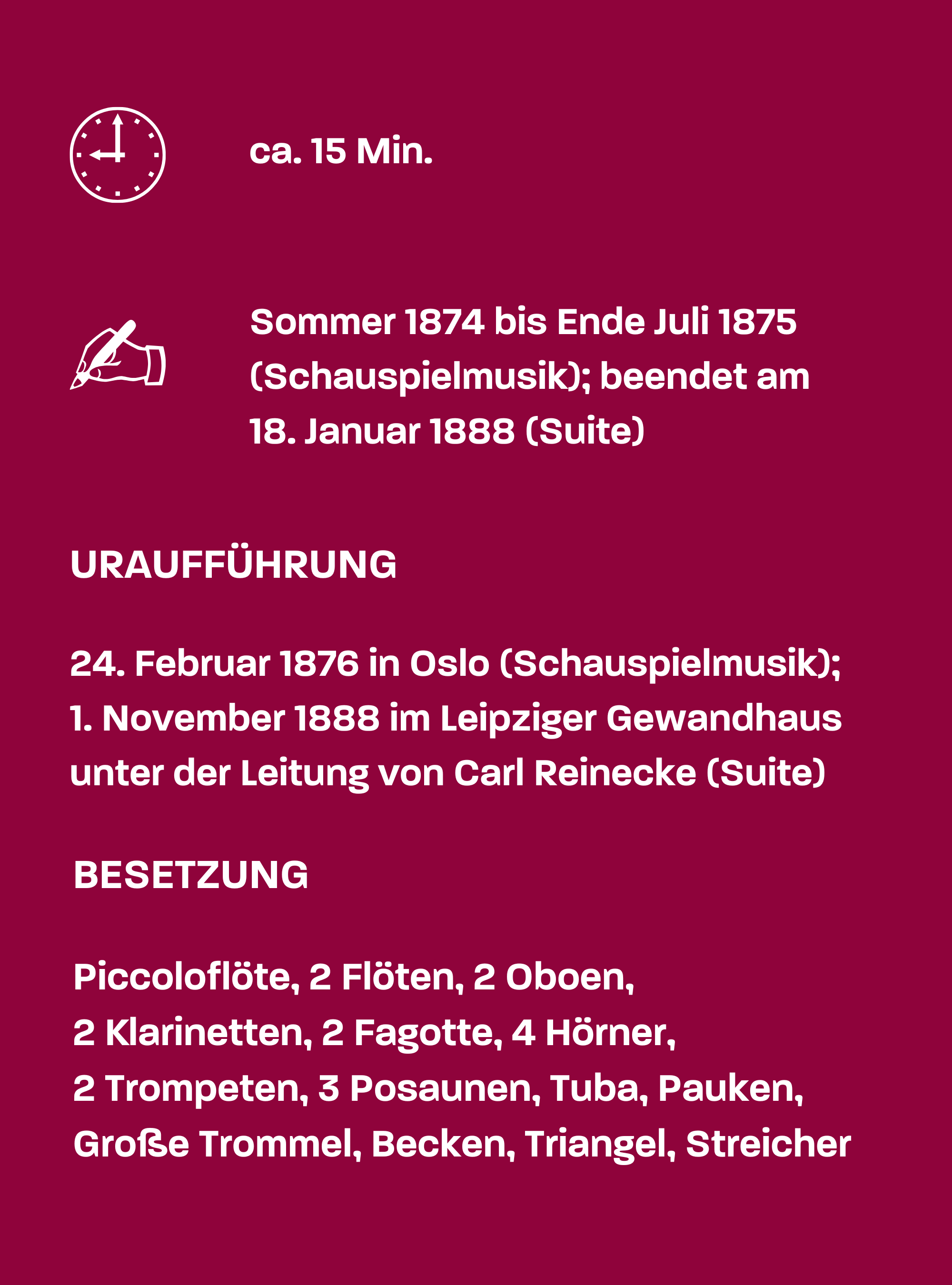 „Lieber Herr Grieg! Ich schreibe Ihnen, um Sie zu fragen, ob Sie sich an einem Projekt beteiligen wollen, das ich auszuführen gedenke. Es handelt sich um folgendes: Ich beabsichtige, ‚Peer Gynt‘ […] für die Bühne zu bearbeiten. Würden Sie die nötige Musik dazu schreiben?“ Als Henrik Ibsen diesen Brief am 23. Januar 1874 schrieb, bedeutete dies die Geburtsstunde einer der beliebtesten norwegischen Kompositionen überhaupt. Denn als er seine fantastische Dichtung zu einem fünfaktigen Bühnendrama „Peer Gynt“ umarbeitete, benötigte er eine Schauspielmusik, bestehend aus Vor- und Zwischenspielen, Tänzen, Gesängen und Melodramen. Die insgesamt 23 Nummern, die in den folgenden zwei Jahren dafür entstanden, bildeten wiederum für Edvard Grieg den Höhepunkt seiner lang ersehnten, jedoch nie realisierten Karriere als Bühnenkomponist. Die Uraufführung des Dramas und der Musik, die insgesamt fünf Stunden dauerte, war ein durchschlagender Erfolg. Wie bei solchen Schauspielmusiken üblich, stellte Grieg aus den zahlreichen einzelnen, teilweise stark mit dem Bühnengeschehen verwobenen Nummern zunächst eine erste viersätzige Suite zusammen, Jahre später eine zweite. Die einzelnen Sätze folgen dabei einer musikalischen Dramaturgie, die nicht mehr ihrer ursprünglichen Position im Drama entspricht. Dort stehen sie in ganz eigenen Kontexten.
