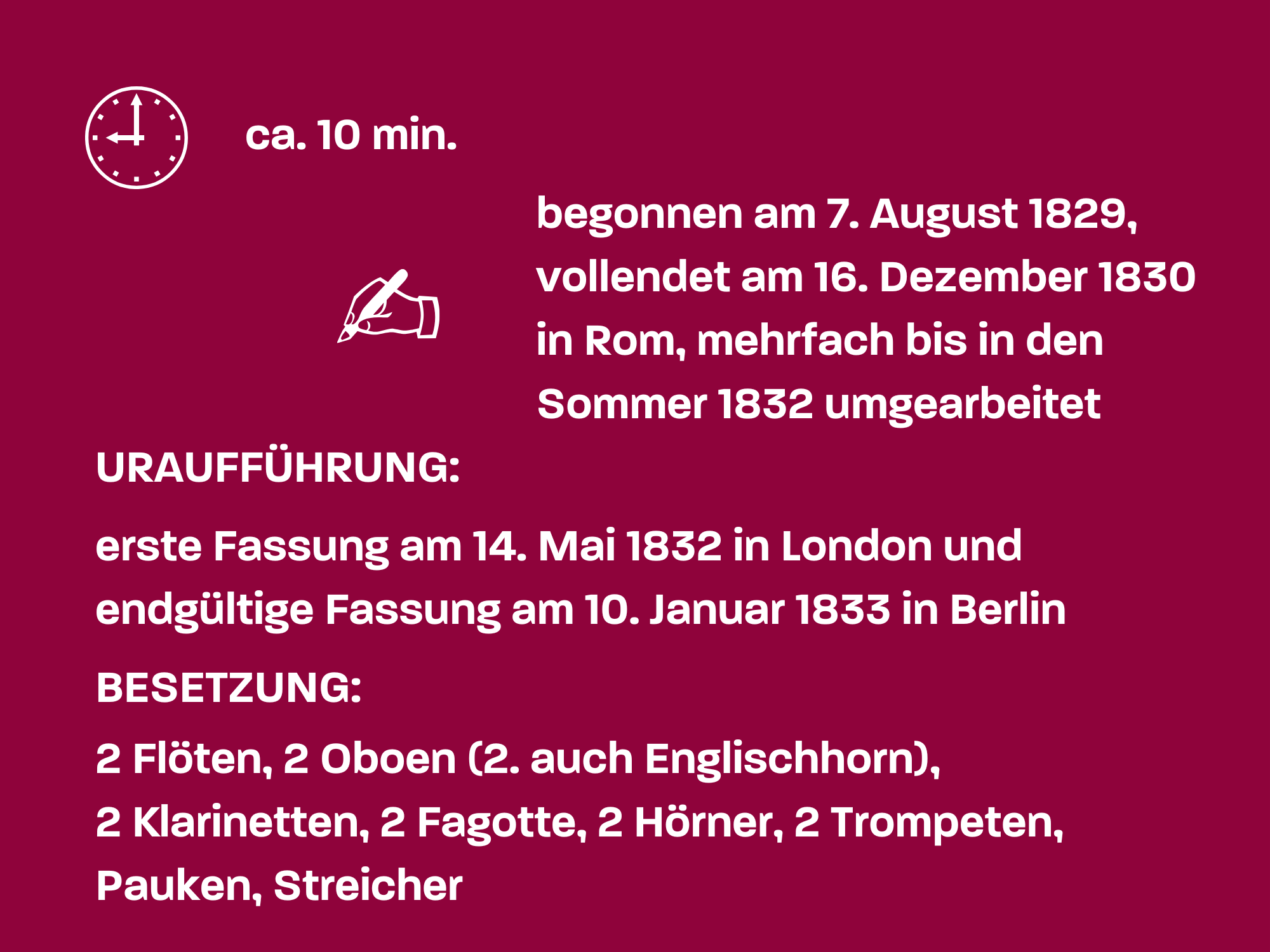 Nicht erst durch die beiden England-Reisen von Joseph Haydn rückte London als englische Musikmetropole enger an das europäische Festland heran. Mit ihrem früh etablierten bürgerlichen Musikleben und einem System aus verschiedenen Veranstaltungssälen, Konzertreihen und Abonnements blieb die Stadt auch im 19. Jahrhundert ein beliebtes Reiseziel für Komponisten, Sängerinnen, Musiker und Virtuosen. Sie alle scheuten die bisweilen unangenehme Überquerung des Ärmelkanals nicht – so auch Felix Mendelssohn. Im Alter von 20 Jahren hielt er sich ab April 1829 für mehrere Konzerte der Philharmonic Society in London auf, bei denen er als Komponist, Dirigent und Solist (am Klavier) wirkte. Nach der Saison trat Mendelssohn gemeinsam mit dem befreundeten älteren Dichter Karl Klingemann (1798–1862) eine Reise quer über die Britischen Inseln an. Anfang August erreichten sie die Nordwestküste Schottlands mit den kargen und vor allem sturmumwehten Inseln der Hebriden – damals (wie heute) keineswegs eines der „auf dem Weg liegenden“ und bequem erreichbaren Reiseziele. Am 7. August setzte sie schließlich zur Insel Staffa über und erkundeten die als Naturwunder berühmte Fingalshöhle. Schon zuvor hatte Mendelssohn nicht nur eine Bleistiftzeichnung davon angefertigt, sondern auch die ersten Takte der Ouvertüre als Particell notiert. „Um Euch zu verdeutlichen, wie seltsam mir auf den Hebriden zu Muthe geworden ist, fiel mir soeben folgendes bey: [es folgen Noten]“, bemerkte er in einem Brief an seine Eltern nach Berlin. Doch so rasch die Inspiration kam, so problematisch gestaltete sich die Ausarbeitung des Werkes. Im Dezember 1830 entstand in Paris eine erste Fassung unter dem romantischen Titel „Die einsame Insel“; sie erschien dem selbstkritischen Komponisten allerdings als zu kontrapunktisch und erinnerte ihn an „Tran und Möwen“. Erst im Februar 1832 wurde ausgerechnet im mediterranen Rom eine zweite Fassung vollendet.