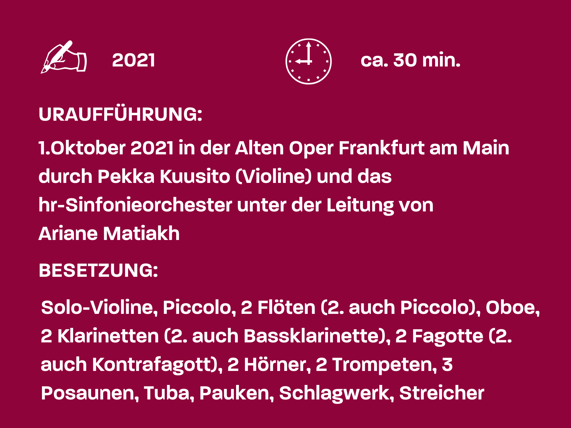 Was bedeutet es also für einen zeitgenössischen Künstler, denselben Weg zu gehen? Und wie beeinflussen die von anderen Künstlern hinterlassenen Artefakte unseren eigenen Weg? Warum fühlen wir uns zu einem Weg hingezogen, den schon so viele vor uns gegangen sind? Was könnte ich sagen, das neu oder spezifisch für meinen eigenen Weg ist? Das waren die Gedanken, die mir durch den Kopf gingen, als ich dieses Konzert für meinen lieben Freund Pekka Kuusisto komponierte und dabei auch an die großartigen Dirigenten und Orchester dachte, die es aufführen würden.“