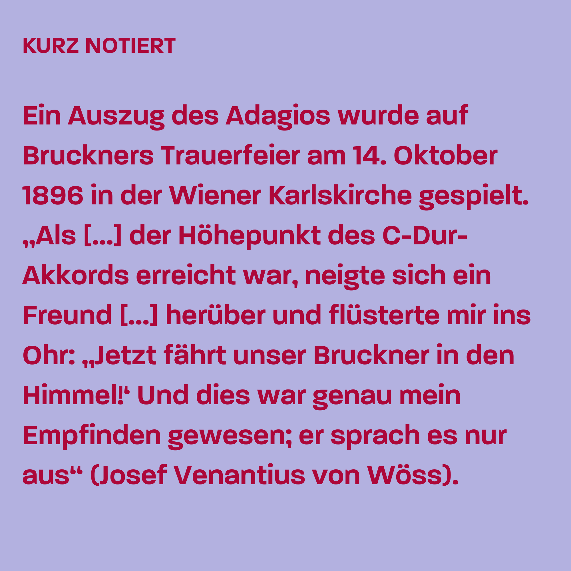Bruckner wählte als Ort der Uraufführung nicht Wien, da er Angst hatte, sein Höhenflug würde wieder beendet werden, sondern ging nach Deutschland, wo das Werk 1884 in Leipzig und 1885 München durchschlagende Erfolge feierte. Wieder daheim wollte er mit einem Schreiben an die Wiener Philharmoniker eine Aufführung in Wien verhindern, „aus Gründen, die einzig der traurigen localen Situation entspringen in Bezug der maßgebenden Kritik, die meinen noch jungen Erfolgen in Deutschland nur hemmend in den Weg treten könnte“ und hielt sogar das Notenmaterial zurück, bis es dann Ende des Jahres als erst viertes seiner Werke in den Druck ging. Hanslick mauserte sich zeitlebens zu einer Art Erzfeind Bruckners, legte dessen Karriere Steine in den Weg, wo er nur konnte, verhinderte als universitärer Gutachter aktiv, dass Bruckner eine Stelle als Kompositionslehrer bekam, und zerriss jedes seiner Konzerte in der Presse, so auch die Siebte nach ihrer einzigen Wiener Aufführung zu Bruckners Lebzeiten 1886. Die achte Sinfonie (Uraufführung 1892) wurde so positiv wie kein anderes seiner Werke aufgenommen, Hanslick konnte er jedoch nie für sich gewinnen: „Alles fließt unübersichtlich, ordnungslos, gewaltsam in eine grausame Länge zusammen. […] Es ist unmöglich, daß diesem traumverwirrten Katzenjammerstyl die Zukunft gehört, – eine Zukunft, die wir nicht darum beneiden“. Bei seiner Widmung der Achten an Kaiser Franz Josef erbat Bruckner auf dessen Frage, ob er noch einen Wunsch hege, sogar kaiserlichen Schutz vor Hanslick, der ihm jedoch verwehrt wurde. Die neunte und letzte Sinfonie blieb unvollendet, Bruckner starb 1896 mit 72 Jahren, bevor er das Finale fertigstellen konnte. Erst in seinem letzten Lebensjahrzehnt bekam Bruckner die Anerkennung, die er sich immer gewünscht hatte.