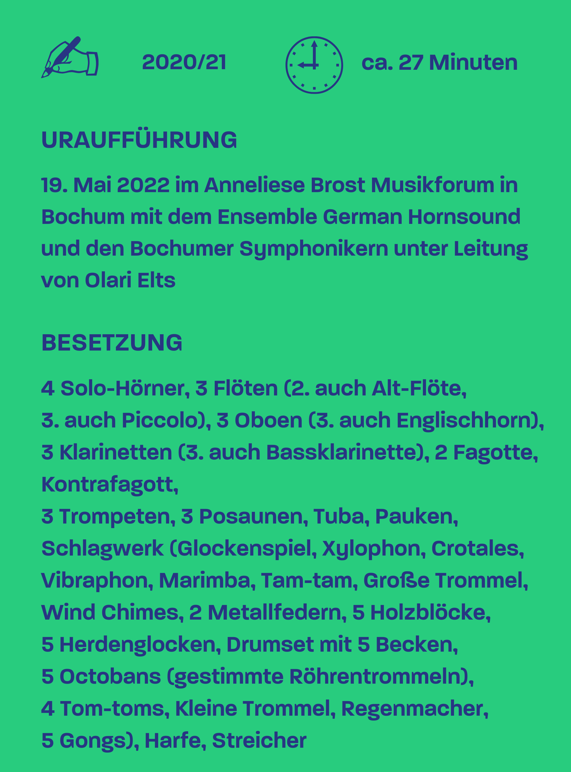 Was aber hat es nun mit der merkwürdigen Wanderung der vier Hornisten auf sich? „Das Waldhornquartett kann als Bote betrachtet werden, der unumkehrbare Veränderungen prophezeit. Wird seine Botschaft verstanden werden? Wie wird die Reaktion sein und wie wird sie sich auf die Kommunikation auswirken? Woher kommen sie überhaupt? Was wollten sie uns sagen? Jeder Zuhörer möge sich mit diesen Fragen nach seinem sozialen Kompass und seiner Vorstellungskraft auseinandersetzen.“ (Erkki-Sven Tüür)