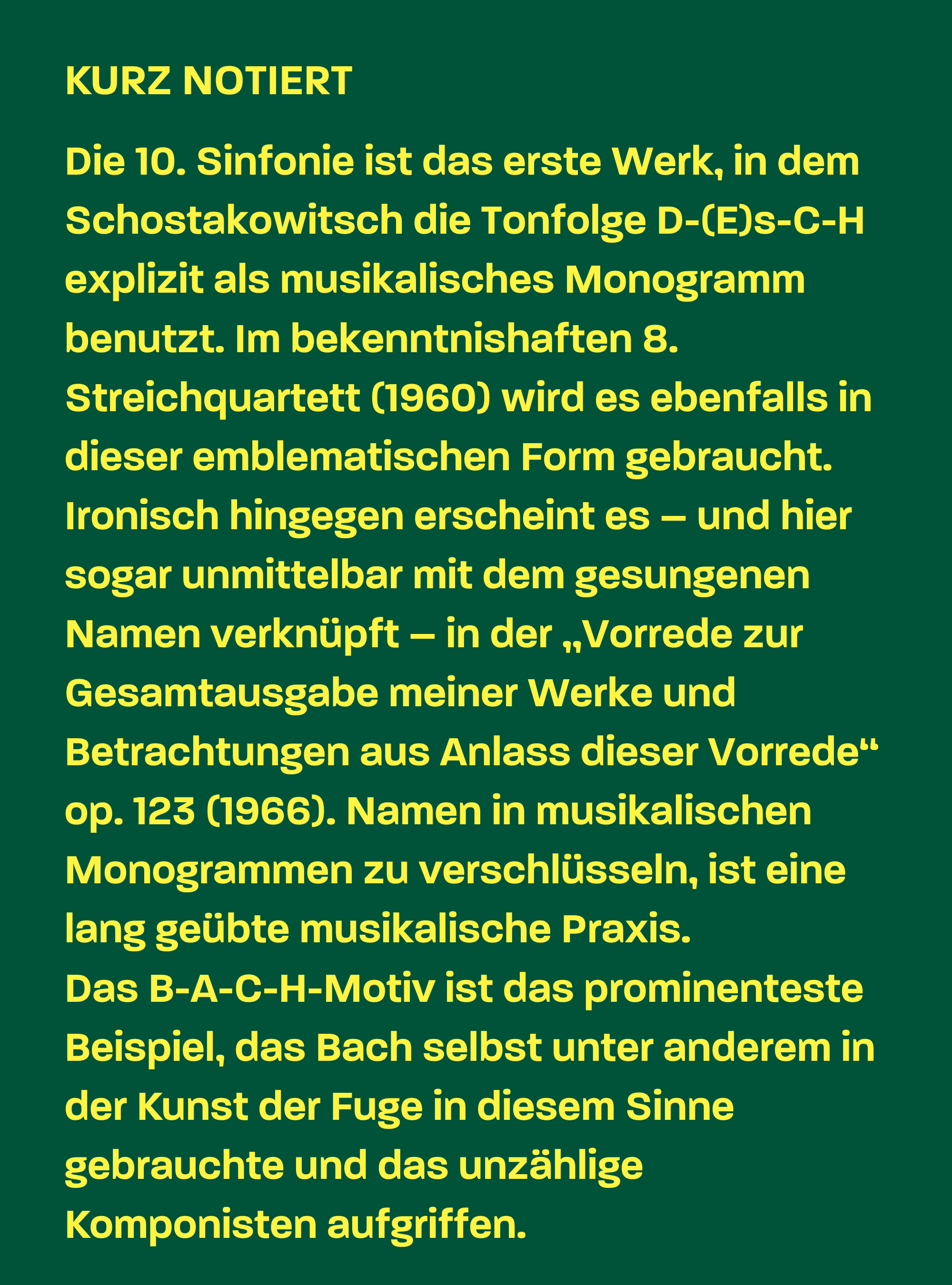 Als 1953 die 10. Sinfonie von Dmitri Schostakowitsch uraufgeführt wurde, entbrannte eine sich über mehrere Jahre bis 1957 hinziehende Diskussion in den Gremien des sowjetischen Musiklebens und der Publizistik über das Für und Wider dieses Werkes. Das Publikum, nicht nur das sowjetische, hatte zwischenzeitlich längst per Akklamation sein Urteil gesprochen: Die 10. Sinfonie avancierte rasch zu einer der am häufigsten gespielten Sinfonien von Schostakowitsch. Um zu verstehen, warum das Werk im buchstäblichen Sinne ein „Politikum“ war, muss man den historischen Kontext betrachten. Die 10. Sinfonie war das Werk eines Komponisten, der in eine geradezu paranoide Situation gezwungen worden war. Seit Schostakowitsch erstmals 1936 massiv ins Visier der stalinistischen Kulturpolitik geriet, war er zu einer Gratwanderung zwischen Subversion und überlebensnotwendiger Anpassung gezwungen. Hatte sich nach den schlimmsten Jahren des Terrors der Druck des Regimes während des Krieges etwas gelockert, zog Stalin die Zügel nach Kriegsende an, und die Welle erneuter Repression erfasste auch die Kultur: 1948 war die Musik an der Reihe. Sie traf jene Komponisten, deren internationaler Erfolg und vor allem deren geistige Unabhängigkeit den Mächtigen ein Dorn im Auge waren: Dmitri Schostakowitsch, Sergej Prokofjew, Aram Chatschaturjan, Wissarion Schebalin, Gawriil Popow und Nikolaj Mjaskowski. In einer am 10. Februar 1948 veröffentlichten Parteiresolution wurden die genannten Komponisten „stark formalistischer Bestrebungen und antidemokratischer Tendenzen, die dem sowjetischen Volk und seinem künstlerischen Geschmack fremd sind“, geziehen und ihnen vorgeworfen, eine „antinationale Richtung“ zu repräsentieren. Im Komponistenverband wurde der Beschluss „diskutiert“, und es überboten sich zumal mediokre „Kollegen“ in Anwürfen gegen die Verurteilten, denen zudem Selbstbezichtigungen abgerungen wurden. Im ganzen Land „debattierten“ die Arbeiter „voller Begeisterung“ über den Beschluss, denn Millionen „einfacher Menschen“ waren sich in der Empörung über Schostakowitsch, Prokofjew und andere Formalisten einig. (nach K. Meyer) Das Treiben ging so weit, dass man Schostakowitschs zehnjährigen Sohn Maxim bei der Prüfung in der Musikschule zwang, seinen Vater ebenfalls zu verurteilen. Anlass für die Kampagne gegen Schostakowitsch boten dessen tragische 8. Sinfonie, die dem verordneten Optimismus Hohn sprach, und erst recht die 9. Sinfonie aus dem Jahr 1945: Statt des von ihm erwarteten monumentalen Lobpreises Stalins und des Sieges im Großen Vaterländischen Krieg hatte Schostakowitsch ein knappes, sarkastisch doppelbödiges Werk komponiert – eine unerhörte Provokation!