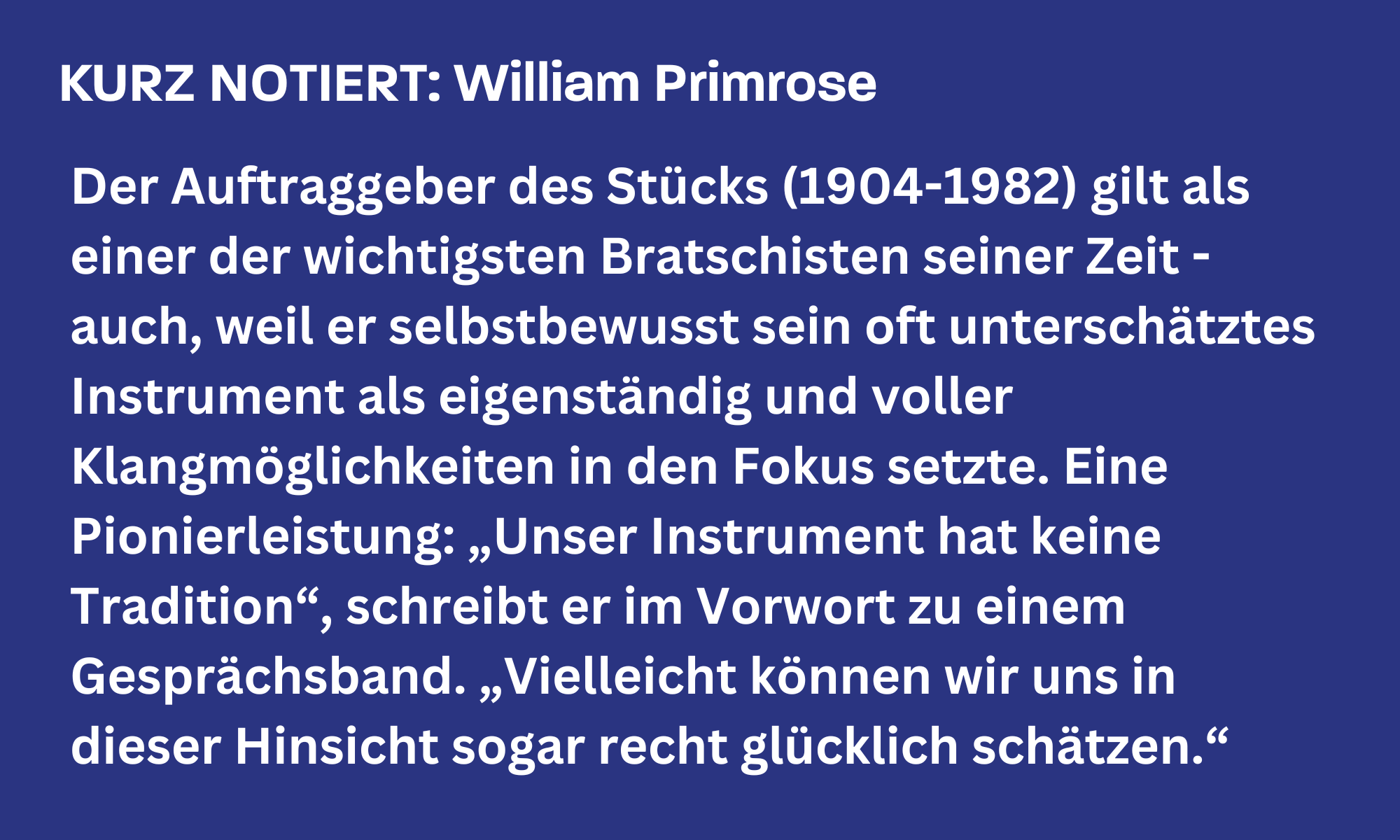 Als er im Sommer 1945 mit der Komposition für das Bratschenkonzert beginnt, bleiben ihm nur noch wenige Wochen zu leben. In einem Brief an Primrose schreibt Bartók Anfang September: „Ihr Violakonzert ist im Entwurf fertig, nur die Orchestrierung muss noch geschrieben werden, das ist eine mechanische Arbeit. Wenn nichts dazwischenkommt, kann ich in fünf oder sechs Wochen damit durch sein.“ Die blieben dem Künstler nicht mehr. Keine drei Wochen nach dem Brief stirbt Bartók. Er hinterlässt aber immerhin den Part der Viola und Skizzen der Orchestrierung.
