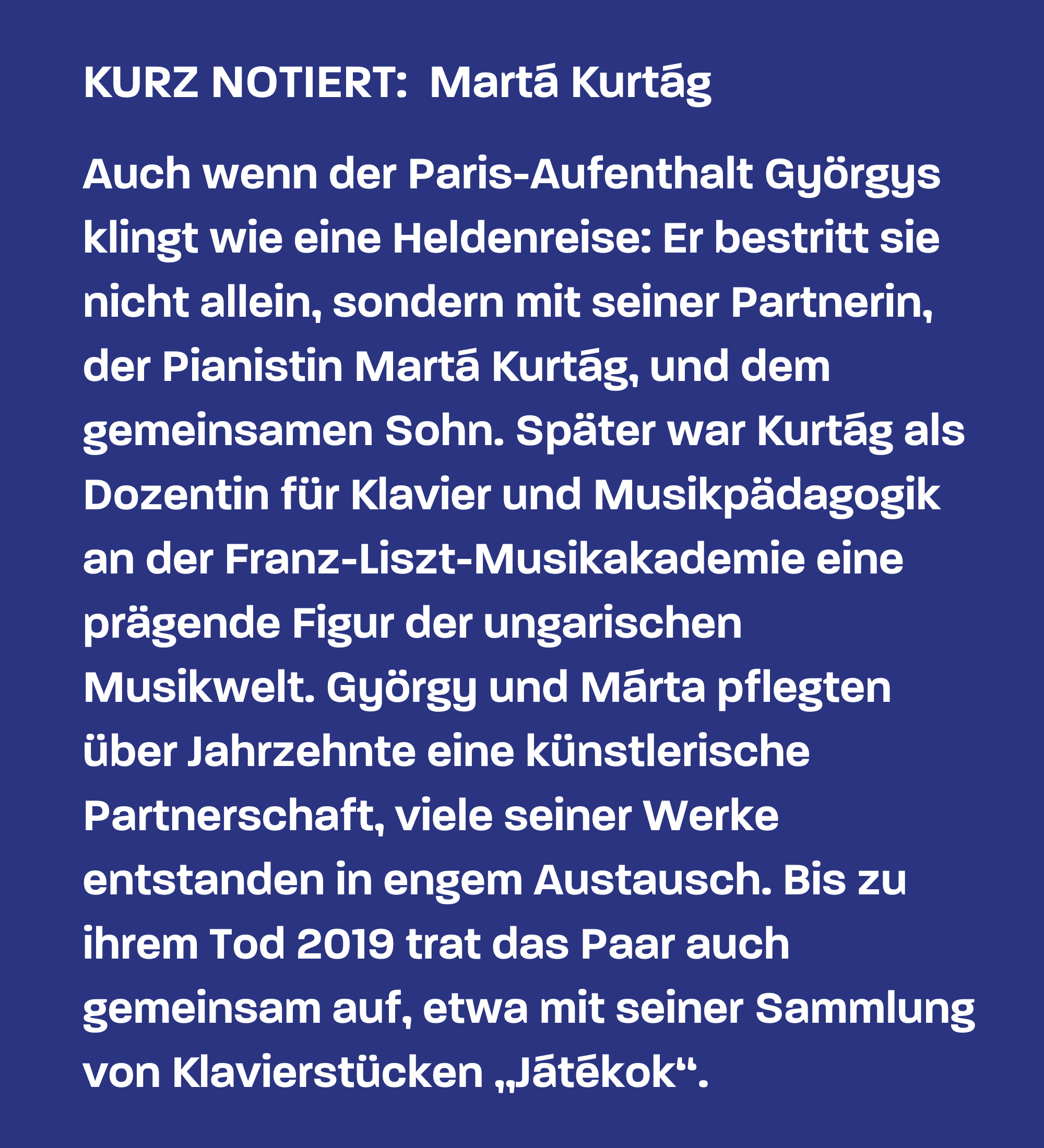 Das weckt etwas auf in ihm. Er lernt Olivier Messiaen kennen und Karlheinz Stockhausen, er liest die Stücke Samuel Becketts, entdeckt die atonale Wiener Schule um Schönberg und Webern. 1959 kehrt er nach Ungarn zurück und setzt bewusst einen neuen Anfang: Das erste Stück, das er dort schreibt, ein Streichquartett, erhält die Opusnummer 1 – gewidmet ist es seiner Therapeutin Marianne Stein. Dass er damit seine Anfänge verwirft, darf aber nicht das Bewusstsein trüben: Auch seine Frühwerke, wie jenes Bratschen-Movement (eigentlich ursprünglich der Auftakt eines zweisätzigen Violakonzerts), sind zarte Klangwesen, aus denen Kurtágs charakteristische Melancholie spricht – wenn man ihnen auch deutlich noch spätromantische Einflüsse anhört und auch das Gewicht, das Béla Bartók für die nachfolgende Generation ungarischer Komponisten hat.
