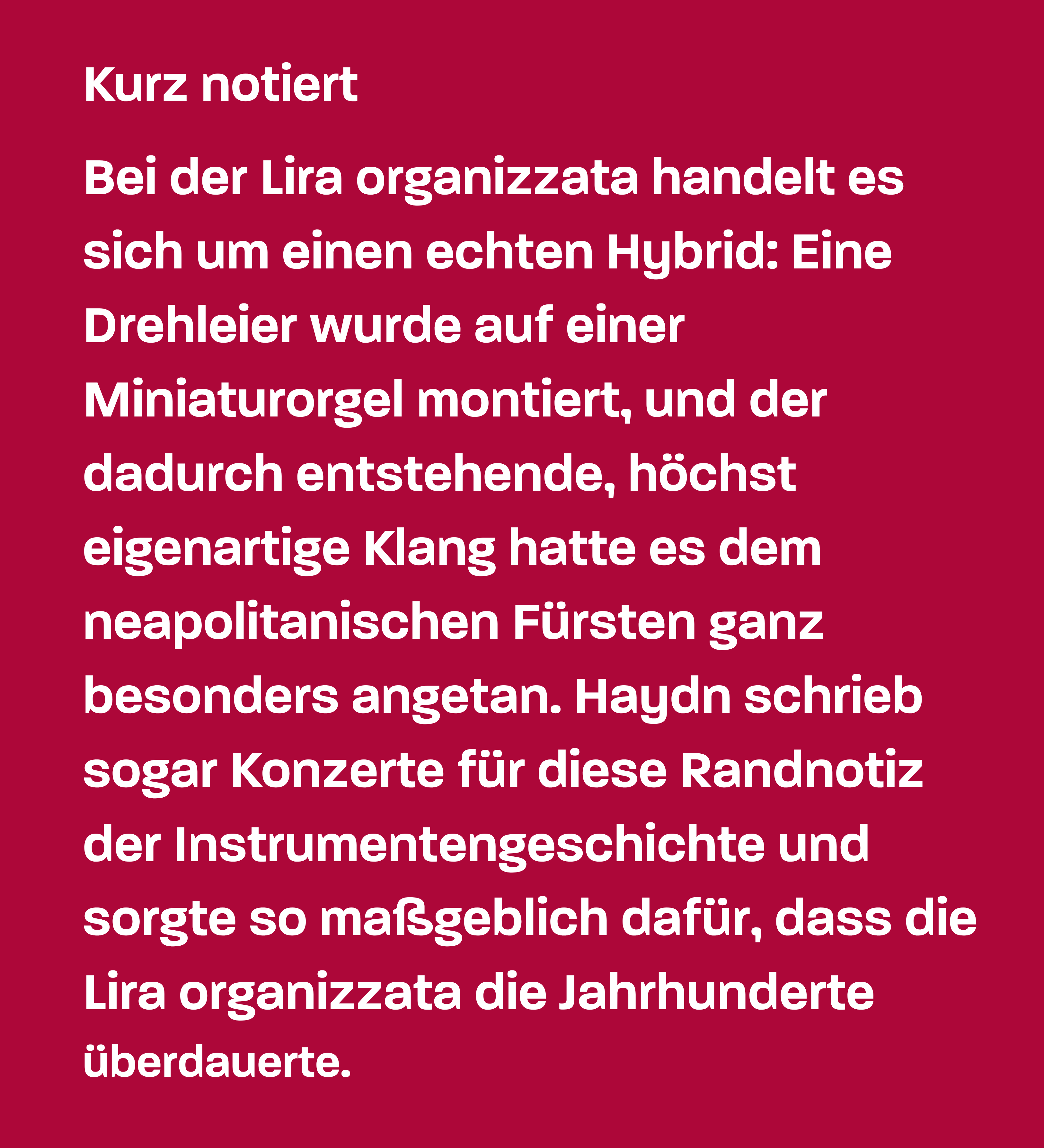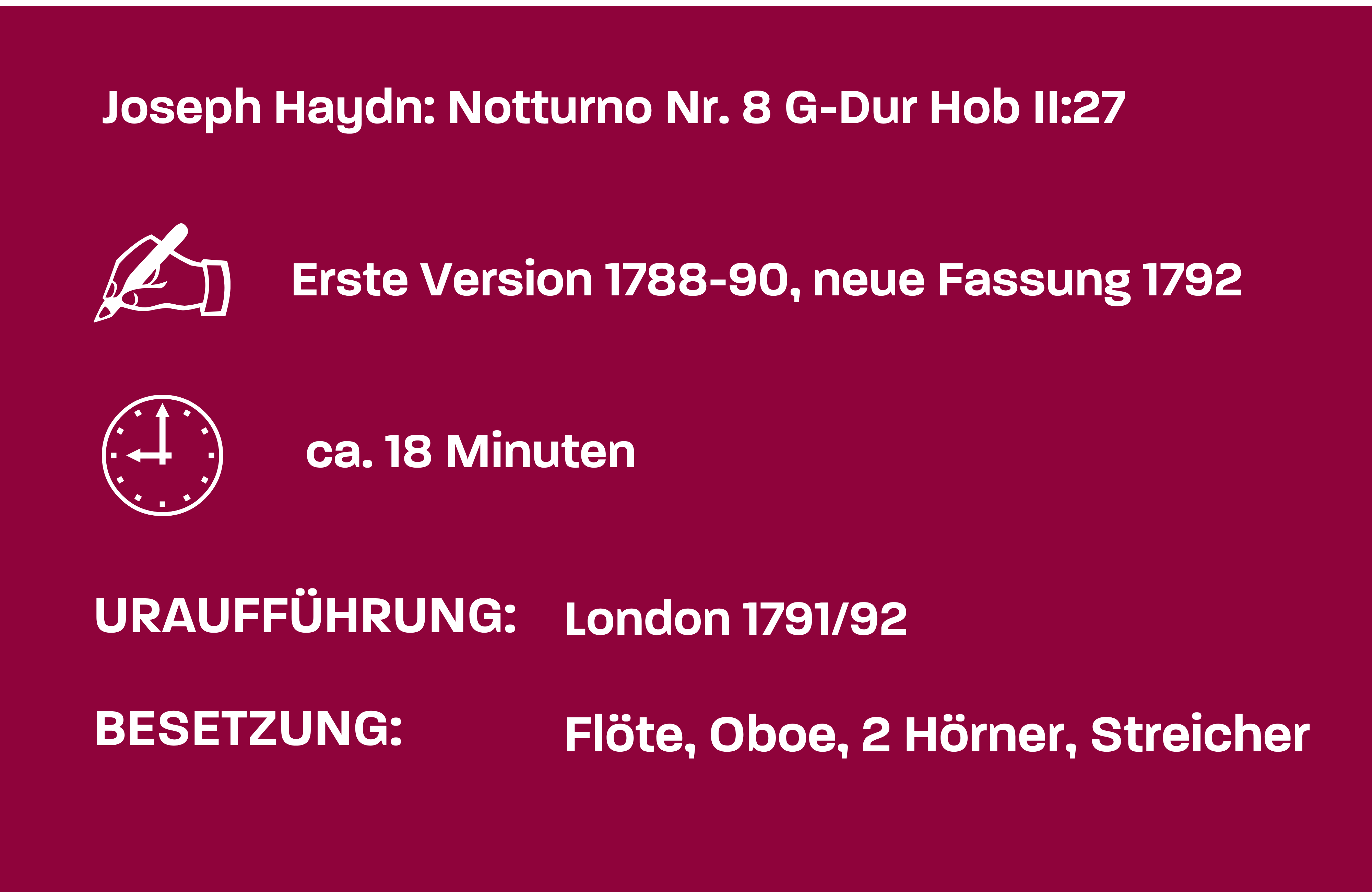 Diese Nachtstücke sind geschrieben für das warme Halbdunkel flackernder Kerzen und ein Kammerensemble von ebenso schummeriger Klangfärbung mit einer Besetzung aus Klarinetten, Viola, Hörnern und einem weiteren Instrumentalkuriosum: der Lira organizzata oder Orgel-Leier. 1890 war mit dem Tod des Fürsten Nikolaus I. auch das Ende von Haydns Anstellung gekommen, und auf der Basis seiner stetig anwachsenden internationalen Auftragslage wagte er nun den Sprung in die kompositorische Selbstständigkeit. Einem Auftrag des Impresarios Johann Peter Salomon folgend brach er in den folgenden Jahren zu zwei phänomenal erfolgreichen Konzertreisen nach London auf, um mit zwei eigens für diese Aufenthalte komponierten Serien von Sinfonien im Londoner Kulturleben für Furore zu sorgen. Mit im Gepäck hatte er neben dieser brandneuen Musik aber natürlich auch ältere Werke wie zum Beispiel seine Notturni – die waren aber für einen deutlich intimeren Rahmen als jenen der großen Londoner Bühnen konzipiert worden, und außerdem ließ sich in der englischen Hauptstadt beim besten Willen nirgendwo eine Orgel-Leier auftreiben. So instrumentierte Haydn diese Stücke neu und kleidete die intimen Notturni dabei in ein helleres, mehr auf Repräsentation abzielendes Klanggewand.