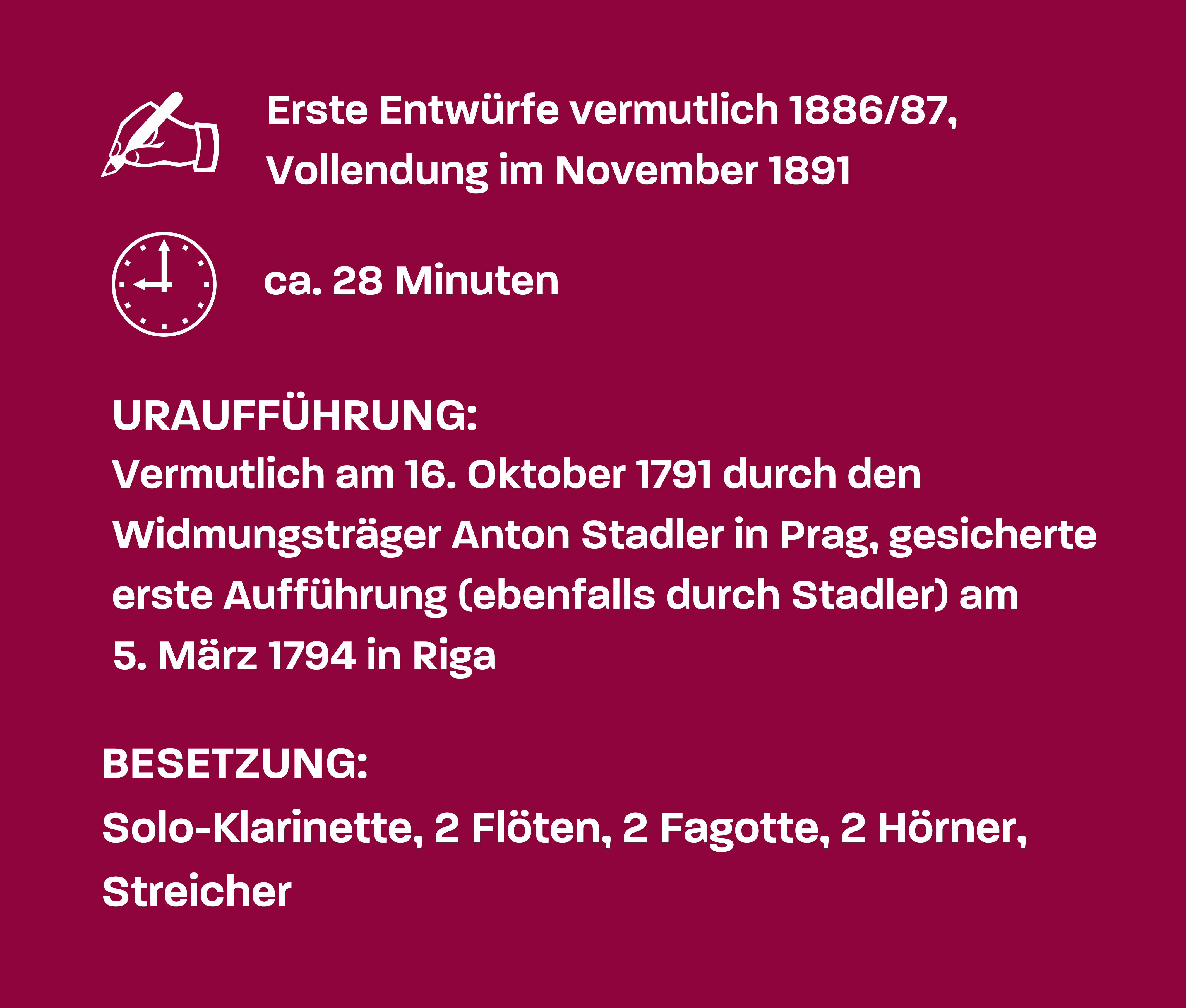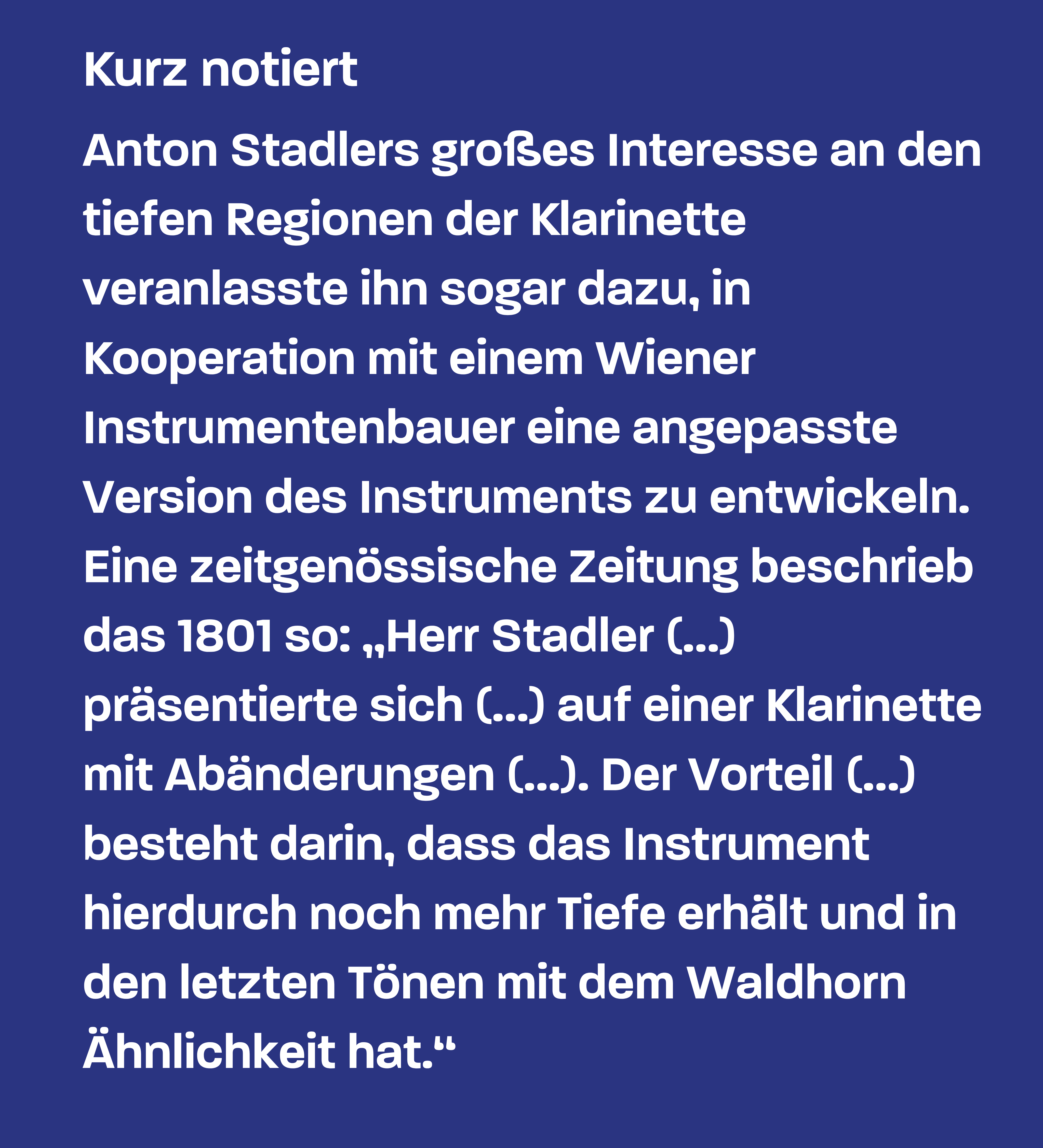 Der erste Entwurf für das Konzert datiert wohl aus der Zeit um 1786/1787 und ist genau genommen gar nicht für Klarinette geschrieben, sondern für eine echte Rarität: das Bassetthorn. Hinter diesem Namen verbirgt sich nicht etwa ein Mitglied der Blechbläserfamilie, sondern eine vergrößerte Version der Klarinette mit gebogenem Endstück, die entfernt an ein Saxophon erinnert. Hauptargument für dieses seltene Instrument war sein erweitertes Tiefenregister, das Mozart besonders gerne und immer wieder einsetzte: 1781 in seiner ersten Wiener Oper „Die Entführung aus dem Serail“, 1789 in einer noch viel exponierteren Rolle, als er es zum Protagonisten seines Klarinettenquintetts macht und diese Gattung damit ganz nebenbei ins Leben ruft. In seinem Todesjahr 1791 schreibt er dann gleich drei Mal für das Bassetthorn, besetzt es im sagenumwobenen Torso seines Requiems und in seiner letzten Oper „La Clemenza di Tito“. Daraufhin erhebt er es schließlich zum unbestreitbaren Hauptdarsteller, als er den einige Jahre alten Konzertentwurf wieder hervorholt, komplettiert und sein letztes großes Werk jenem Virtuosen widmet, der ihn maßgeblich zu all diesen Kompositionen inspiriert hatte: Anton Stadler.