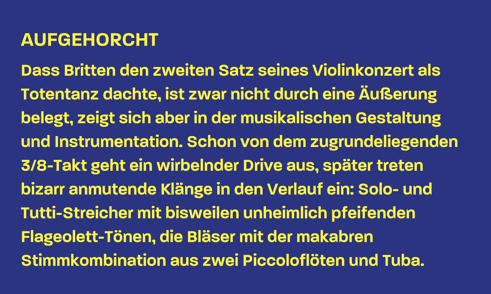 It is therefore no coincidence that the timpani play a clearly perceptible role in the opening movement, not only at the beginning but also throughout the rest of the work - clearly more than just an allusion to Beethoven's Violin Concerto op. 61 from the no less decisive year 1806, when Emperor Franz II declared the Holy Roman Empire of the German Nation extinct after almost 1000 years, King Friedrich Wilhelm III declared war on France, the Prussian state collapsed and Napoleon marched into Berlin. In fact, the movement can be interpreted in the broadest sense as an exploration of the violin repertoire up to the then current works by Stravinsky and Berg. The following Scherzo is reminiscent of a dance of death (also in contrast to the preceding calmer tempo). With the finale, entitled Passacaglia, Britten draws on a formal model from the 17th and 18th centuries, in which a frequently repeated, melodically moulded bass model forms the stable basis for ever new figures and characters - until the solo violin breaks away from it in a plaintive song at the end...