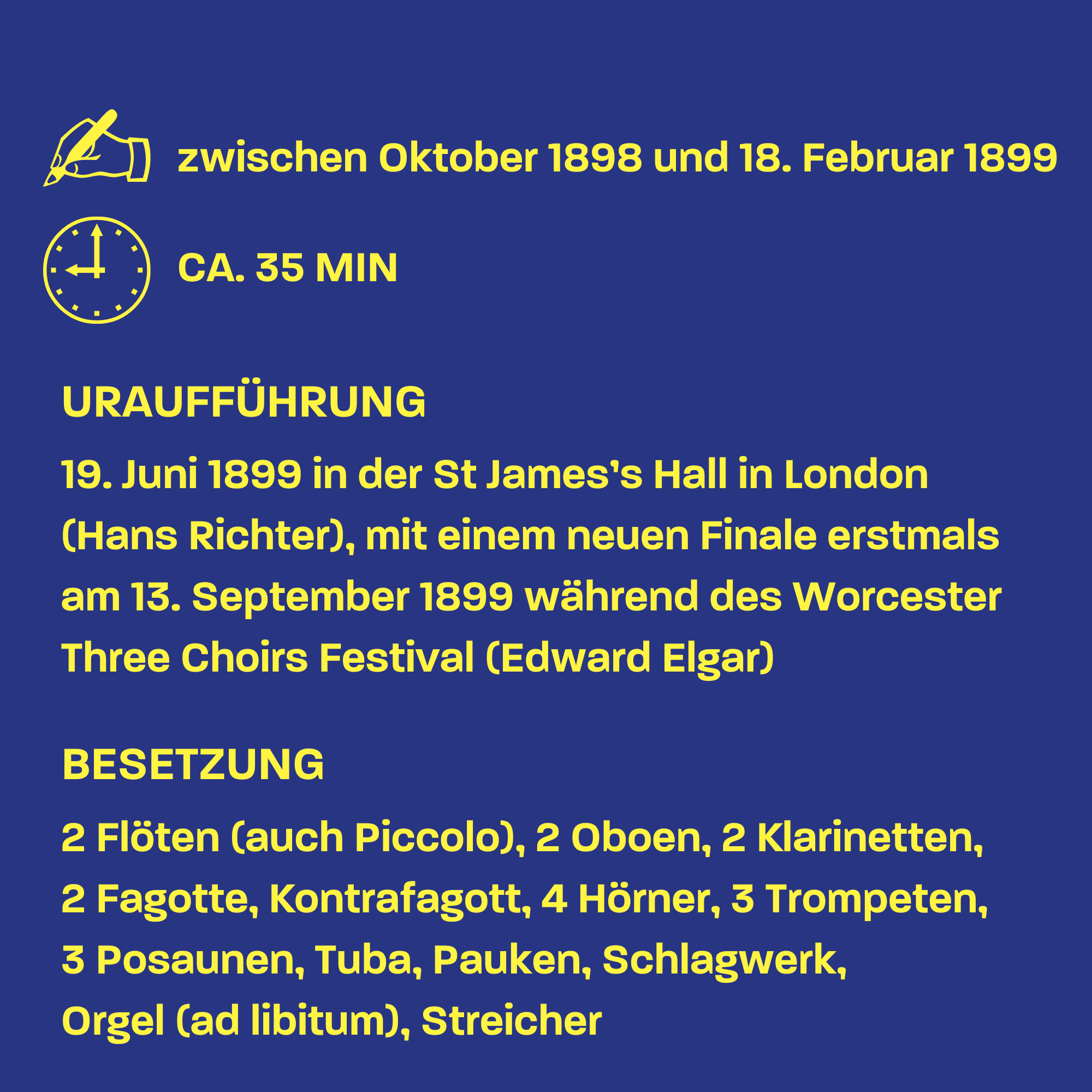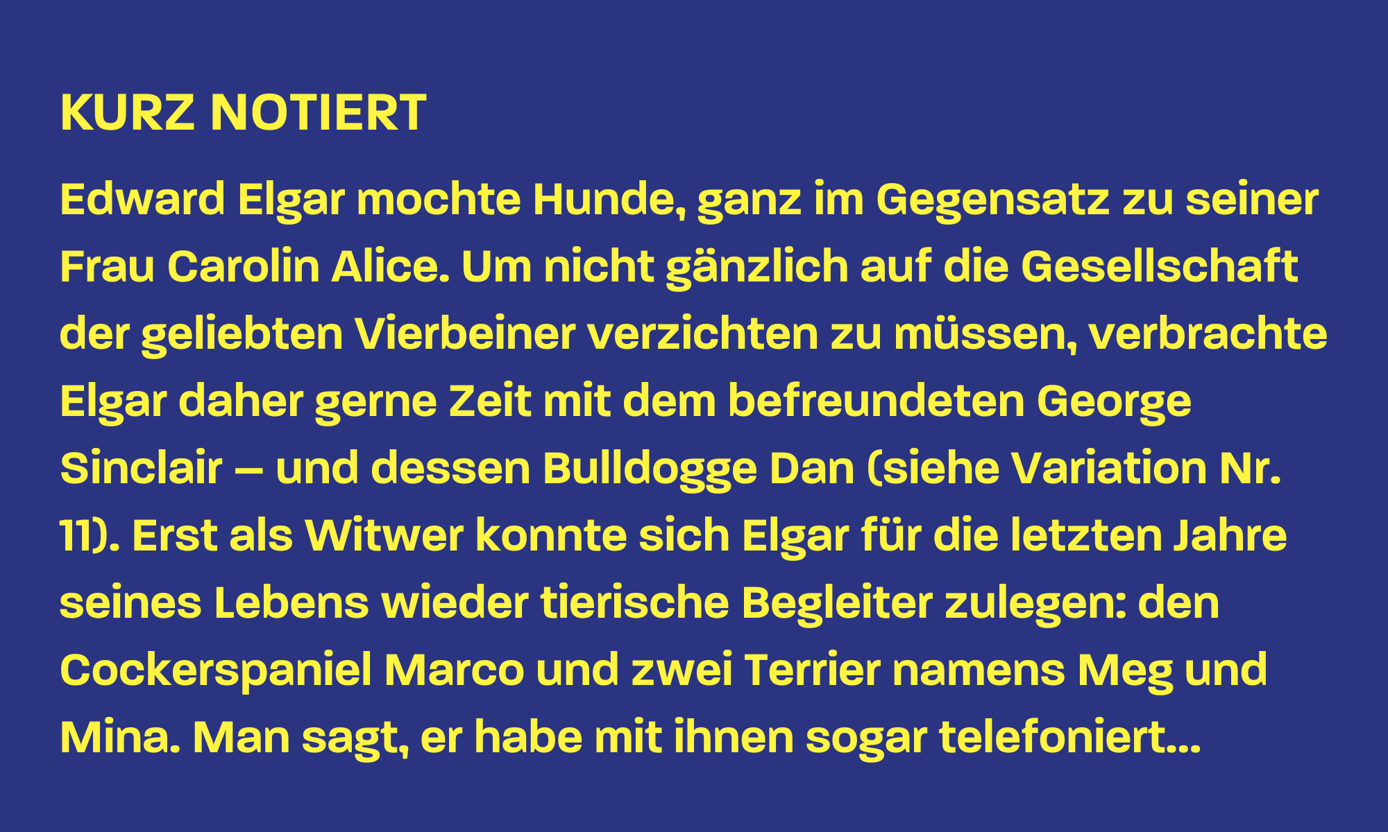 Written in 1898/99, they are a perfect example of the pompous splendour of the Victorian era, supported by a progressive-minded middle class that was growing economically as a result of industrialisation. This era of grand salons and cultivated social life is also reflected in all the initials or pseudonyms that Elgar prefixed to each variation: they designate the composer himself (E.D.U.), his wife Alice (C.A.E.) and the family friends, who for the uninitiated cannot be further identified. In 1913, Elgar finally published a small pamphlet entitled ‘My Friends Pictured Within’ to resolve the abbreviations. That he was not always serious about the characters is shown by his note to Variation No. 11 (G.R.S.), which is dedicated to George Robertson Sinclair, designated organist of Hereford Cathedral in 1899. Elgar commented: ‘This variation has nothing to do with organs or cathedrals, and only marginally with G.R.S.. The opening bars are inspired by his huge bulldog Dan falling into the river on a steep bank; her paddling upstream to find a landing place and her joyful barking as she lands. G.R.S. said ‘Put that to music’ - here it is.’ In Variation No. 13 (* * * *), the quotation of a motif from Felix Mendelssohn Bartholdy's overture ‘Meeresstille und Glückliche Fahrt’ is again of musical significance. It is intended to symbolise a sea voyage undertaken by Lady Mary Lygon at the time of composition.