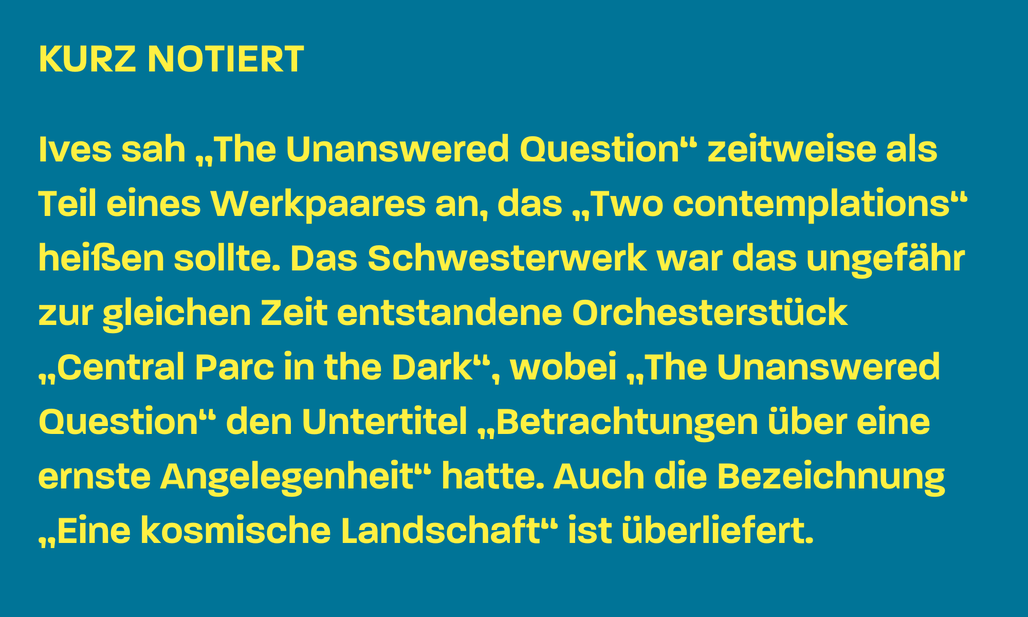 In diesem Jahr wäre Charles Ives, der große amerikanische Avantgardist, – wie Arnold Schönberg – 150 Jahre alt geworden. „The Unanswered Question“ schrieb er in einer ersten Version 1908. Erstmals aufgeführt wurde Ives‘ Komposition allerdings erst knapp vier Jahrzehnte später. Das hatte nicht nur etwas mit der Ignoranz seiner Zeitgenossen zu tun, sondern vor allem damit, dass Ives die Mechanismen der Kulturindustrie aushebelte und den Kapitalismus mit seinen eigenen Waffen schlug. Seinen Lebensunterhalt sicherte er sich als erfolgreicher Versicherungskaufmann. In seiner Freizeit aber brachte er seine klanglichen Visionen zu Papier – ohne Rücksicht auf die Hörerwartungen eines Publikums und auf aufführungspraktische Probleme. Die Gegebenheiten des Musiklebens interessierten ihn nur wenig, und er bemühte sich auch nicht sonderlich um Aufführungen seiner Werke. So dauerte es bis in die letzten Jahrzehnte des 20. Jahrhunderts, bis allmählich wahrgenommen wurde, dass Ives ein Komponist außerordentlichen Ranges gewesen war.