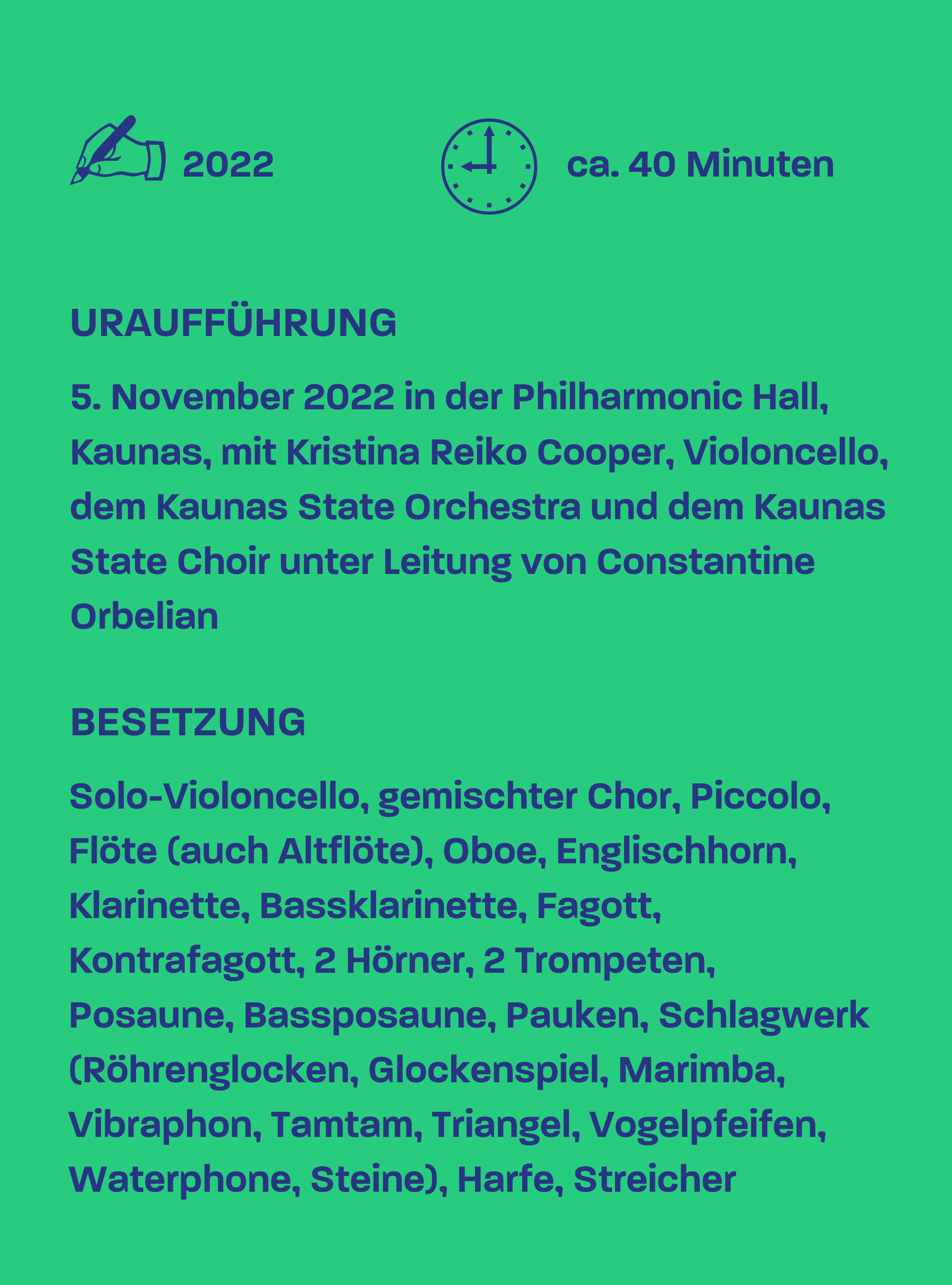 Die japanisch-amerikanische Cellistin hat weltweit für ihre musikalische Vielfalt, ihre Kunstfertigkeit und ihre charismatische Bühnenpräsenz Anerkennung gefunden. Als Solistin und Kammermusikerin stand sie auf vielen Bühnen der Welt und konzertiert mit weltweit renommierten Orchestern. Kürzlich ist sie zur Co-Direktorin der New Yorker Gruppe für neue Musik Continuum ernannt worden. Sie hat zahlreiche Werke von Komponist*innen wie Philip Glass, Mario Davidovsky, Ryuichi Sakamoto, Tania Leon, Josef Bardanashvili und Benjamin Yusupov uraufgeführt. Im November 2022 trat sie als Solistin in der Weltpremiere von „Vessels of Light” in Kaunas auf, die von Yad Vashem nach ihrer Idee in Auftrag gegeben wurde, das Heldentum von Chiune Sugihara, japanischer Vizekonsul in Litauen während des Zweiten Weltkrieges, zu ehren. Der Vater ihres Mannes, Irving Rosen, wurde dank der Visa, die Sugihara in Kaunas ausgestellt hatte, gerettet. Weitere Aufführungen dieses Werks führten und führen Frau Cooper in die Carnegie Hall, nach Los Angeles, Napa, Mexiko-Stadt, Prag, Warschau, Berlin, Dresden, Leipzig und Paris. Kristina Reiko Cooper erhielt ihren Bachelor- und Master-Abschluss in Musik sowie ihren Doktortitel in Musik an der Juilliard School, wo sie bei Joel Krosnick studierte. Derzeit ist sie Gastprofessorin an der Buchmann Mehta School an der Universität Tel Aviv und stellvertretende Vorsitzende der America-Israel Cultural Foundation sowie tätig im Vorstand des Charney-Forums für neue Diplomatie.