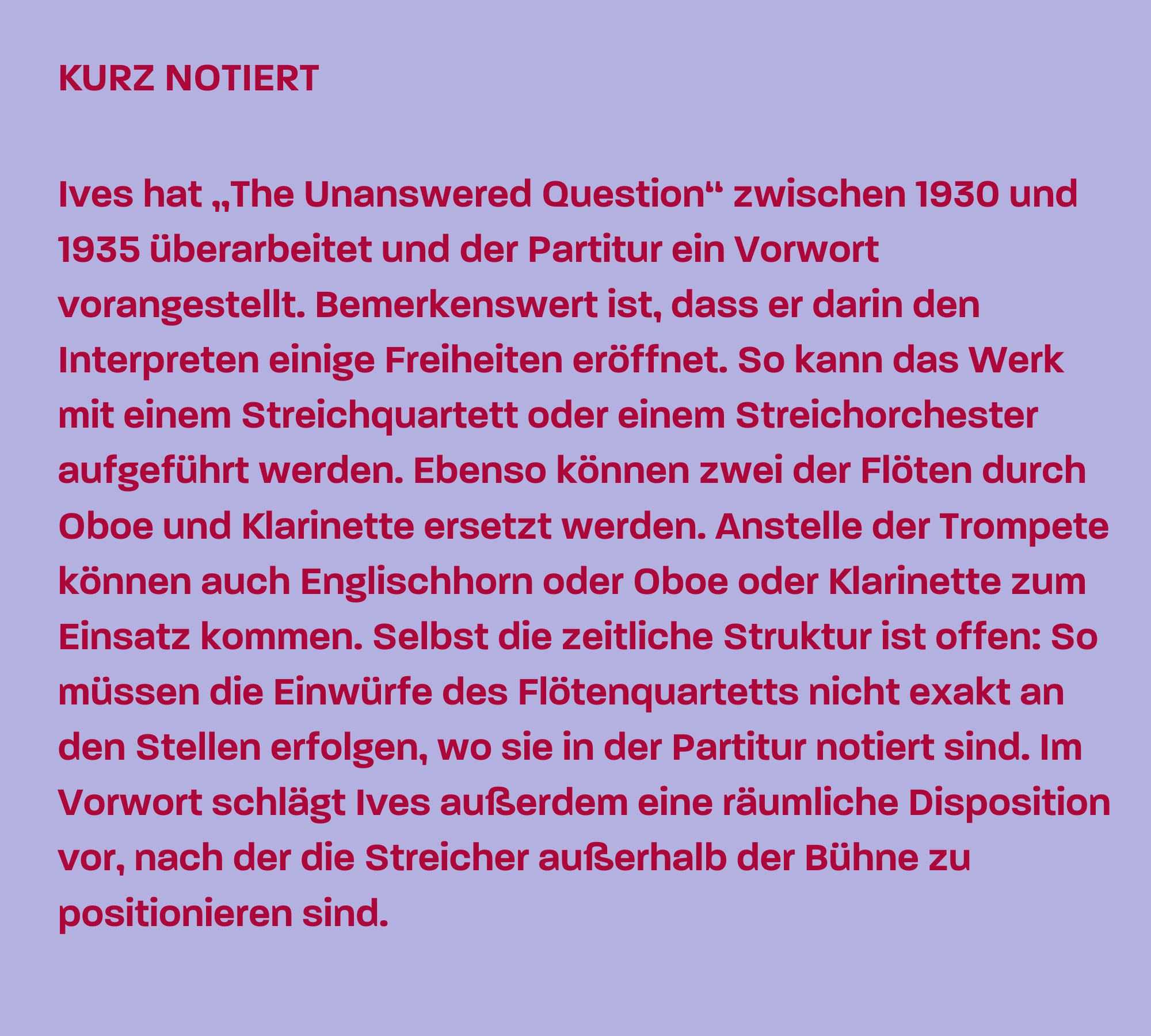 Die klangliche Umsetzung dieses poetischen Bildes, das die vergebliche Suche nach einer Antwort auf die Frage nach dem Sinn der Existenz umschreibt, ist ebenso einfach wie einleuchtend und gleichzeitig typisch für Ives‘ Vorliebe für die Gleichzeitigkeit unabhängiger Verläufe. Auf drei klanglich, harmonisch, teilweise zeitlich und räumlich selbständigen Ebenen spielt sich das musikalische Geschehen ab: Die Streicher intonieren weiträumige Akkorde, die wenige Harmonien umkreisen. Die Trompete stellt über diesem Klangteppich sechs Mal die „Frage“ in Gestalt eines nur minimal veränderten Motivs. Jedes Mal löst sie eine immer mehr gesteigerte Aktivität des überaus dissonant gesetzten Flötenquartetts aus, das gleichsam vergeblich nach einer Antwort sucht, ehe die Frage ein letztes Mal ertönt und unbeantwortet verhallt.