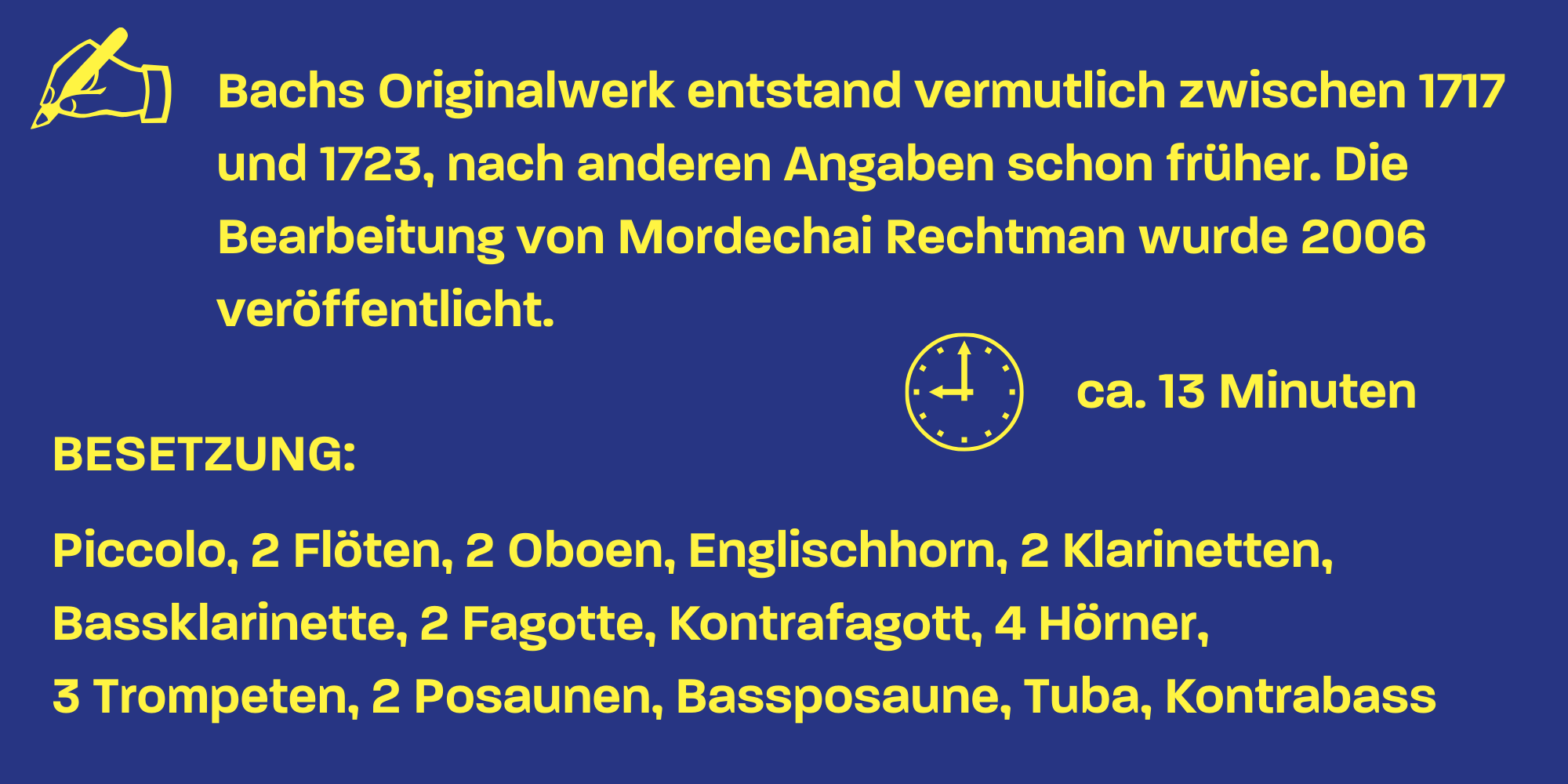 Mordechai Rechtman, dessen Bearbeitung in diesem Konzert erklingt, war ein israelischer Fagottist, Dirigent und Hochschullehrer, der sich als geschickter Arrangeur einen Namen gemacht hat. Insgesamt mehr als 200 Werke von Bach bis Fauré hat er für verschiedene Bläserformationen arrangiert. Rechtman, geboren 1926, stammte aus Barmen (heute ein Teil von Wuppertal). Nachdem die Familie nach Palästina emigriert war, begann er Fagott zu lernen und brachte es innerhalb von drei Jahren auf diesem Instrument so weit, dass er als 15-Jähriger Solo-Fagottist im Palestine Opera Orchestra wurde. 1946 übernahm er diese Funktion im Philharmonic Orchestra, aus dem später das Israel Philharmonic Orchestra wurde, dem er bis 1991 angehörte.