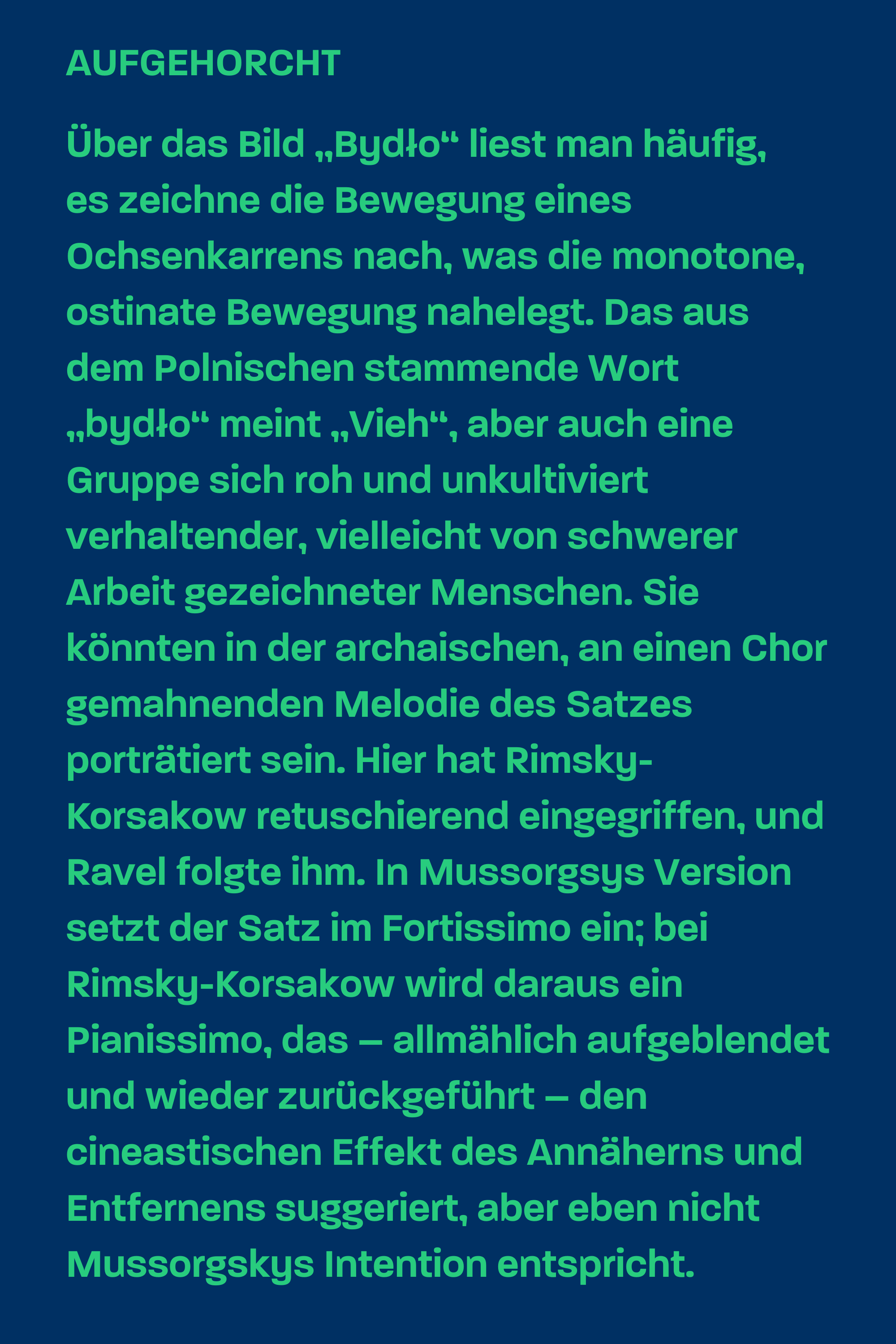 Das latent Szenische der Bilder wird insbesondere greifbar, wenn Mussorgsky die Begegnung zweier Juden nachzeichnet. Beide werden zunächst einzeln in grotesker Überzeichnung portraitiert und dann gleichsam aufeinander losgelassen. Um jüdisches Kolorit zu erzeugen, bedient sich Mussorgsky eines „schablonenartigen Orientalismus“, wie Christoph Flamm meint. Man kommt leider nicht umhin, in dieser musikalischen Karikatur – in Mussorgskys Manuskript sind die beiden Vornamen in Anführungszeichen gesetzt – Spuren jenes Antisemitismus zu erkennen, der gerade in den national gesinnten Kreisen russischer Intellektueller im 19. Jahrhundert weit verbreitet war und gegen den auch Mussorgsky nicht gefeit war. Das den Zyklus insgesamt kennzeichnende Kontrastprinzip ist insbesondere nachzuvollziehen, wenn wir vom Marktplatz in Limoges mit seinem geschäftigen Treiben in härtestem Schnitt in die Katakomben von Paris versetzt werden: Wie Monolithe hallen die Harmonien ins unendliche Dunkel. Aus ihnen löst sich ein Nachspiel (Mit den Toten in einer toten Sprache), welches das Promenaden-Thema aufgreift, als beschwöre der Komponist seinen toten Freund. Die „Hütte der Baba-Jaga“ erscheint gleichsam als das Pendant zum „Gnomus“-Bild und mündet in das Finale, das einen Hymnus, an orthodoxe Gesänge erinnernde Choralweisen und das Promenadenthema – und somit dezidiert russisch konnotierte Klänge – apotheotisch verbindet.