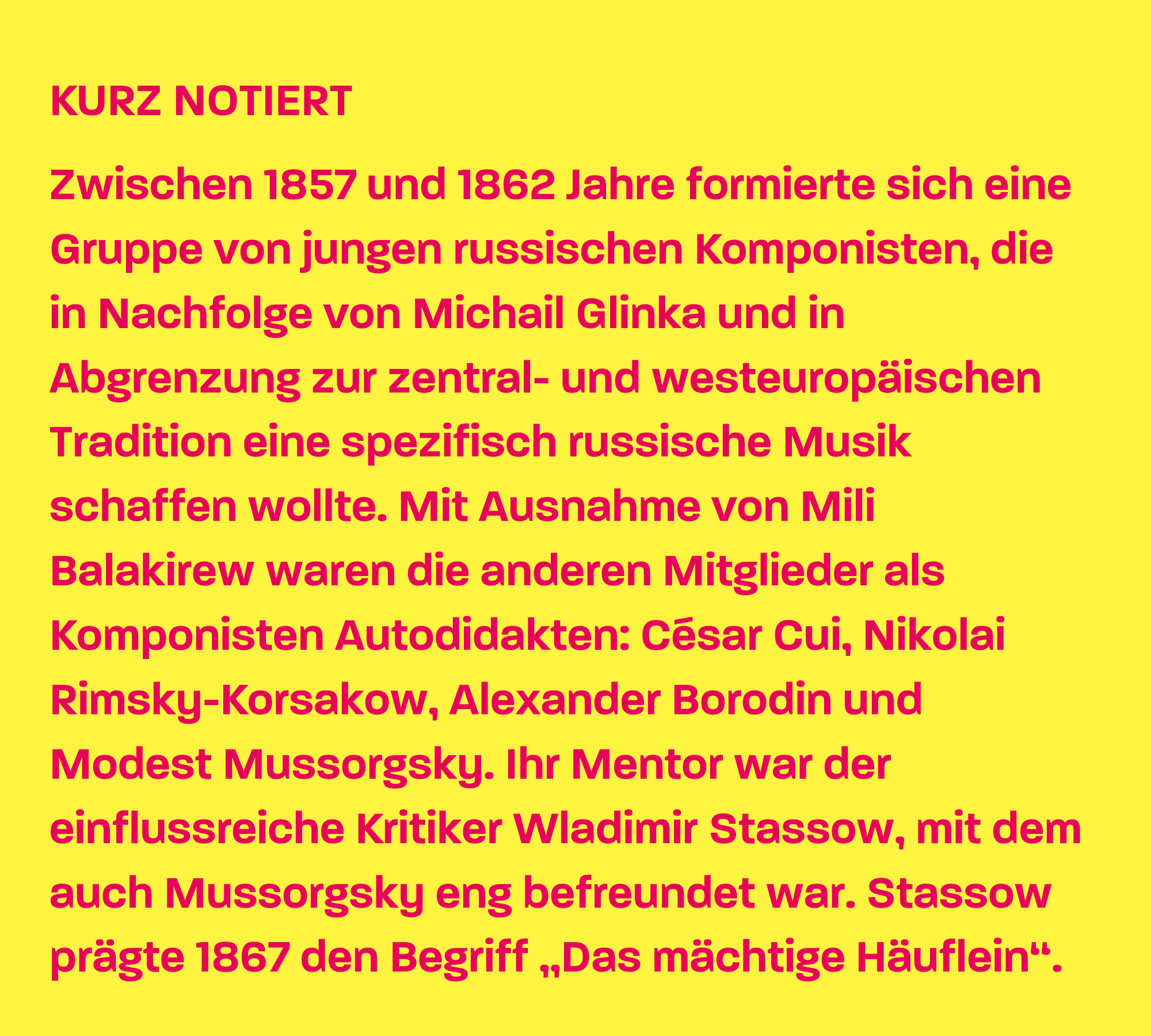 Dass die „Bilder einer Ausstellung“ einst zu einem der beliebtesten Werke des Konzertrepertoires avancieren sollten, war diesem Zyklus wahrlich nicht an der Wiege gesungen worden. Der Reihe nach: Anfang der 1870er Jahre hatte sich die Bindung zwischen den Komponisten des „Mächtigen Häufleins“ merklich gelockert. Mussorgsky suchte stattdessen eher den Kontakt zu bildenden Künstlern. Vermittelt von Wladimir Stassow kam er wahrscheinlich im Winter 1870/71 mit Viktor Hartmann in Kontakt, der als Maler, Illustrator, Architekt und mit Arbeiten für Theater ähnliche, auf die Schaffung einer spezifisch russischen Kunst ausgerichtete Bestrebungen verfolgte wie Mussorgsky auf dem Gebiet der Musik. Beide wurden schnell enge Freunde, und so war Mussorgsky zutiefst betroffen, als Hartmann 1873 im Alter von 39 Jahren an einem Herzleiden starb. 1874 organisierte Stassow eine Gedenkausstellung für den gemeinsamen Freund, auf die Mussorgsky möglicherweise auf Anregung Stassows musikalisch reagierte und die „Bilder einer Ausstellung“ innerhalb weniger Wochen im Juni 1874 komponierte.