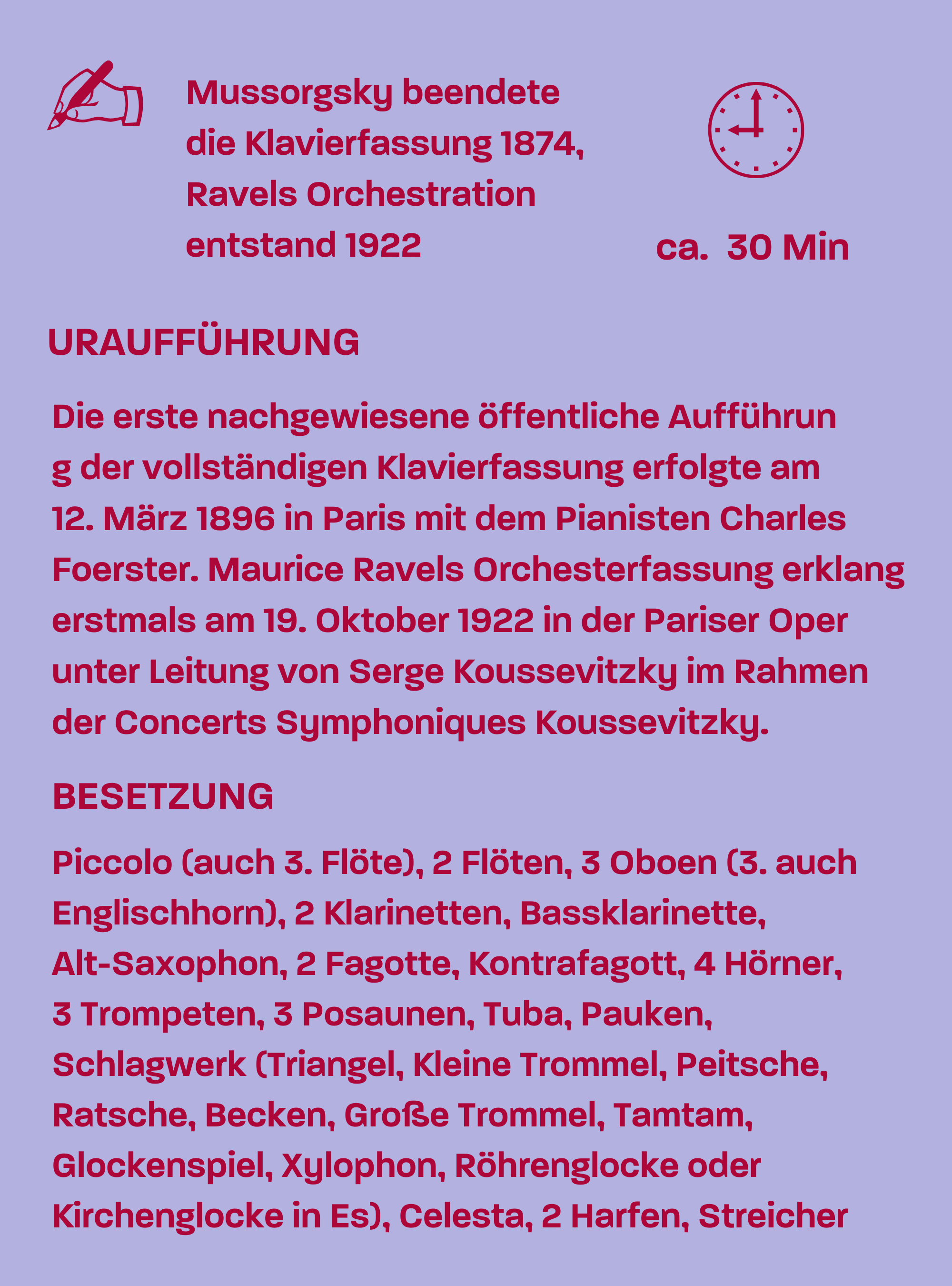 Zur zunächst geplanten Drucklegung kam es freilich aus ungeklärten Gründen zu Lebzeiten Mussorgskys nicht – ebenso wenig zu einer öffentlichen Aufführung. Erst 1886 erschien eine von Nikolai Rimsky-Korsakow redigierte Druckausgabe, die zwar den Notentext weitgehend korrekt wiedergibt, aber dennoch in die Struktur des Zyklus eingreift: Die „Attacca“-Angaben, welche die meisten Teile des Werkes verbinden, wurden gestrichen, und die von Mussorgsky ohne Überschrift belassenen Zwischenspiele bekamen nun jeweils den Titel „Promenade“. So wurde aus dem weitgehend durchkomponierten Zyklus eine eher suitenartige Folge von Stücken. Es verging ein weiteres Jahrzehnt, ehe das Werk erstmals in Gänze öffentlich aufgeführt wurde: am Ende einer Serie von Gesprächskonzerten in Paris, die Mussorgskys Musik gewidmet waren. In Russland erklang die komplette Klavierfassung erstmals 1903 in Moskau. Im Publikum saß damals Serge Koussevitzky, der wenige Jahre später als Dirigent von sich reden machen sollte. 1920 emigrierte er aus der jungen Sowjetunion und ließ sich in Paris nieder, wo er 1921 die Concerts Symphoniques Koussevitzky gründete, die sich vor allem dem russischen Repertoire widmeten. Er bat Maurice Ravel, eine Orchesterfassung der „Bilder einer Ausstellung“ zu erarbeiten und hätte keinen Geeigneteren finden können: Ravel verehrte die Musik Mussorgskys zutiefst, hatte schon zuvor gemeinsam mit Igor Strawinsky an einer Fassung von Mussorgskys unvollendet hinterlassener Oper „Chowantschina“ mitgewirkt und war ein genialer Instrumentator. Die Uraufführung der „Bilder einer Ausstellung“ in seiner Orchestrierung geriet zum sensationellen Erfolg und sorgte nun – ein halbes Jahrhundert, nachdem der Zyklus komponiert worden war – dafür, dass das Werk jene ungemeine Popularität bekam, die bis heute ungebrochen ist.