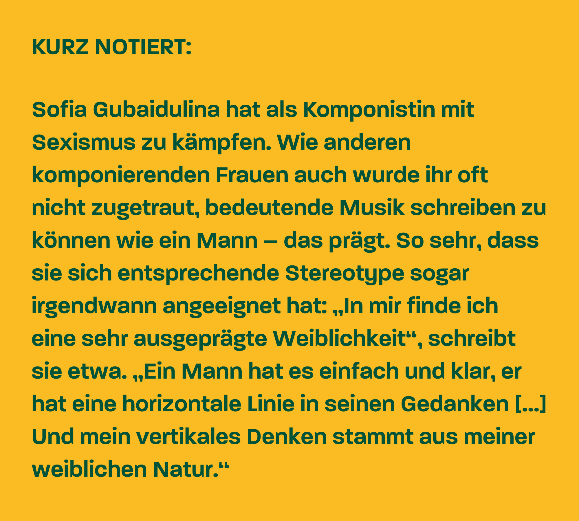 Komponist*innen sind nämlich nie frei von der Umwelt, in der sie aufwachsen und leben. Ihr Werk erhebt sich nicht über die Umstände, denen es entsprungen ist. Vor diesem Hintergrund ist Gubaidulinas Bekenntnis auch ein demütiges: Sie ist ganz und gar Mensch, und was sie erschafft, wird nie übermenschlich oder „genial“ sein.