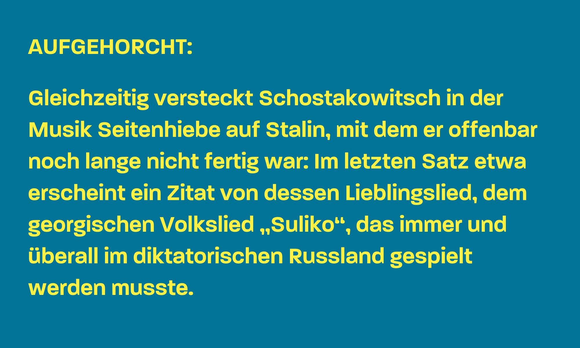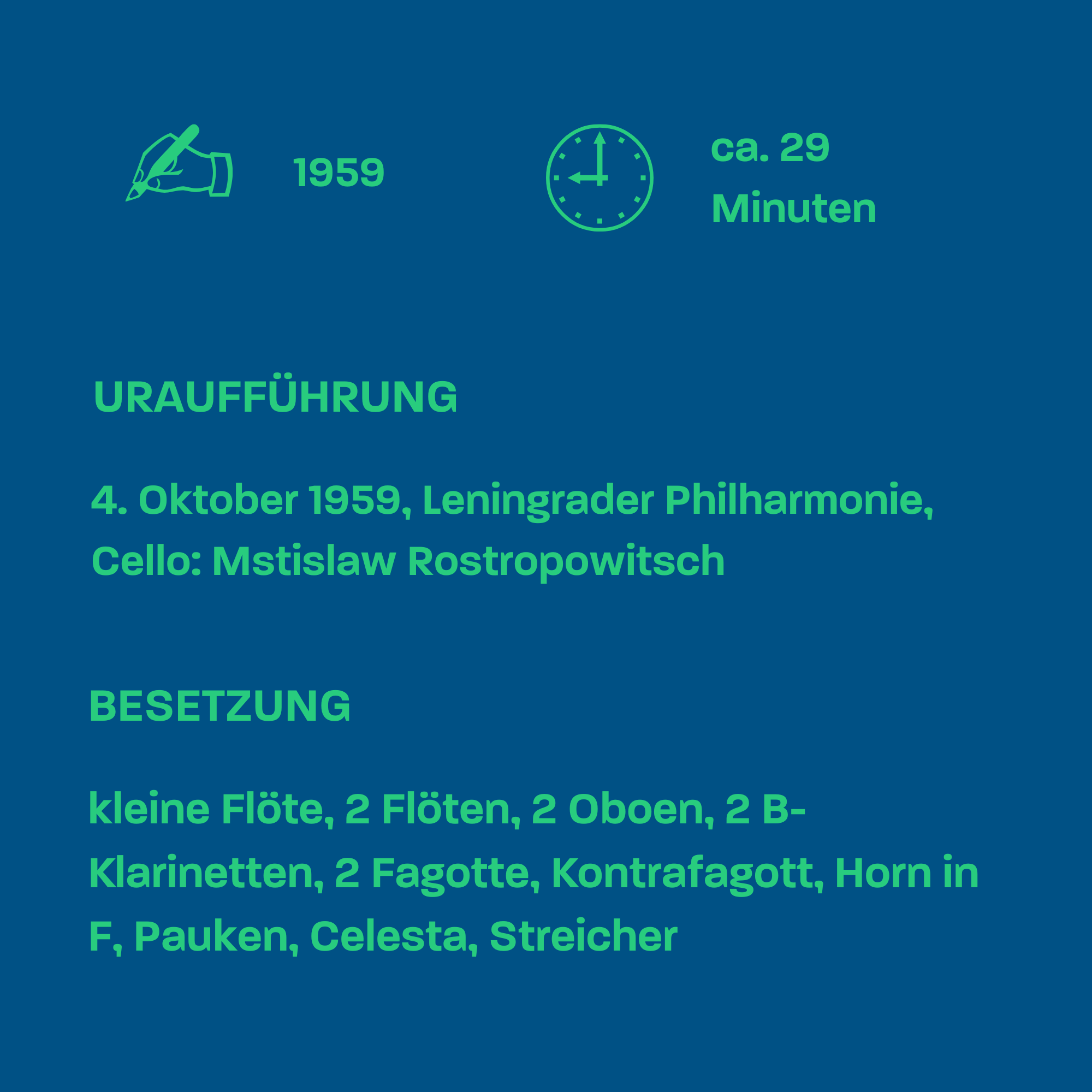 Im gleichen Jahr schreibt Schostakowitsch sein erstes Cellokonzert Nr. 1 Es-Dur op. 107 und widmet es seinem Schüler und Freund Mstislaw Leopoldowitsch Rostropowitsch. Schostakowitschs Name rehabilitiert sich zu dieser Zeit nach und nach, denn Josef Stalin war seit mehreren Jahren tot – dessen diktatorische Herrschaft samt Schikanen und Drohungen gegenüber Künstler*innen wie Schostakowitsch und seiner Familie hatten letzteren mehrfach an den Rand des Selbstmords getrieben. Immer wieder spiegelt der Komponist seine Angst, seinen Überlebenskampf, seine Zweifel und Hoffnung in einem musikalischen Anagramm: D-S-C-H, in deutschen Notenbuchstaben d-es-c-h. Musikalisch lässt er es in Werken wie seinem 8. Streichquartett oder der 10. Sinfonie mit der musikalischen Umwelt interagieren, auf sie reagieren, verschwinden oder triumphieren – als leiste „der Einzelne […] Widerstand gegen die ganze Welt“. (Albert Breier)