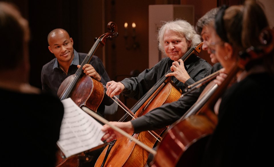 Surrounded by the cello section with Artist in Residence Sheku Kanneh Mason (rehearsal for the ensemble concert in January 2025.) Photo: Simon Pauly